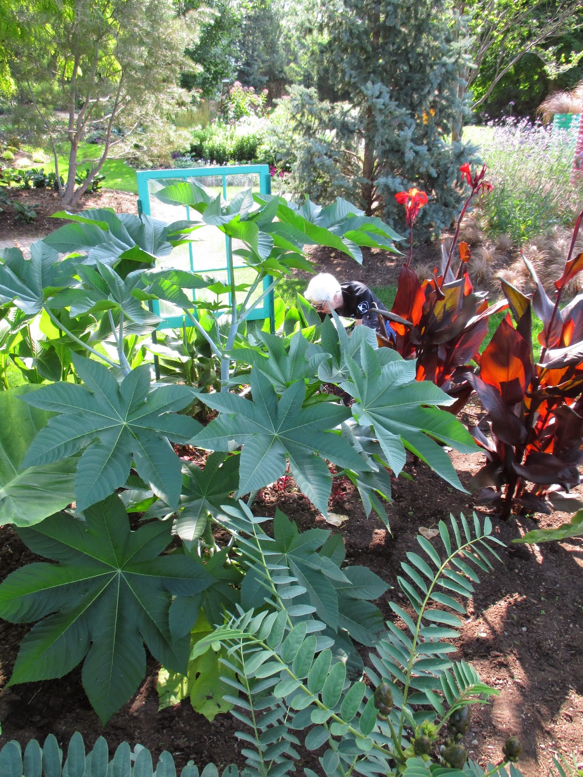 Can you spot the volunteer!? Nancy can be seen past the 'Zanzibariensis' castor bean (Ricinus communis) to the left and she's just to the right of the blue window!