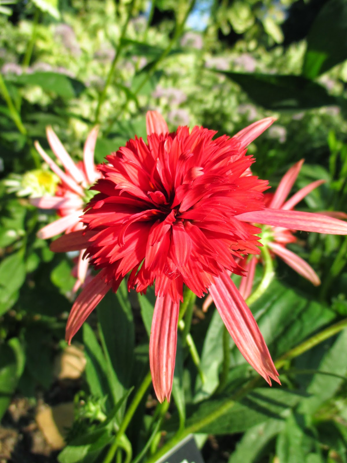 The staff had a busy day. Above are Big John (left) and Larry helping Janice re-secure the Cosmos Collection (70 varieties) that had started to flop a bit. Both guys also had mowing, watering and other gardening duties. Janice also worked on labeling, the cutting display, weeding and other tasks aside from the cosmos duties. Cheryl worked on weeding multiple areas and yard watering. Cindy had planting, watering, fertilizing and more work in the Nancy Yahr Memorial Children's Garden. I was able to apply more herbicide in some tough areas with vigorous carpeting weeds. I also placed plants for installation throughout the week and continue preparations for the Fall Plant Sale (see our website soon for details...). Below are more photos from today.