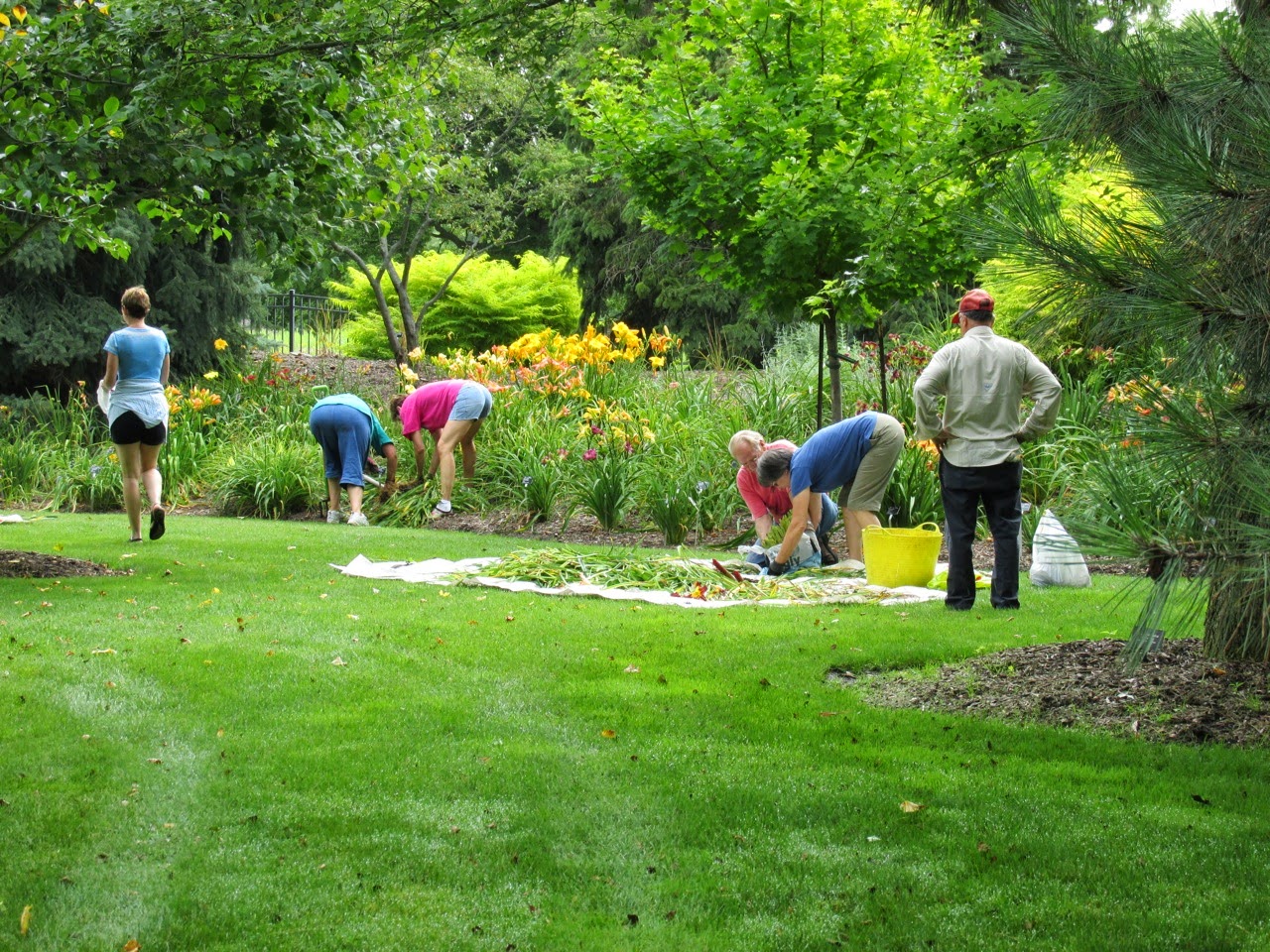 We had a great turnout of Grumpies today and two Grumpettes. Above is Del peeling label stickers which is a never ending chore. Below is Pat M. mulching near the gazebo garden. Pat had many other projects as well. Ron Y., Jim, Vern and Bob K. worked on finishing up our obelisks (for sale!) and other carpentry projects. Dr. Gredler did his mowing rounds and Bill O. was in for some odds and ends. Bob C. (second photo down) watered the Thomas Jefferson Collection and helped with some edging later in the morning. Gary S. also helped with this edging project (fifth photo down, to the left) and helped Big John finish up. Maury worked on our gutter repairs at the Horticulture Center and ran errands. The third photo down shows Shirley who was a weeding whirlwind in three different garden areas. Eva spent her time targeting weeds in the gazebo garden. The fourth photo down shows Ron R. (left) and Gary B. mulching around the arborvitae (Thuja sp.) hedges surrounding the sunken garden. Lisa I. came in to check on the daylilies after the dividing project yesterday (see bottom photos and caption) and we also saw Dr. Yahr, Bev D., Marsha M., Urban and many others today.