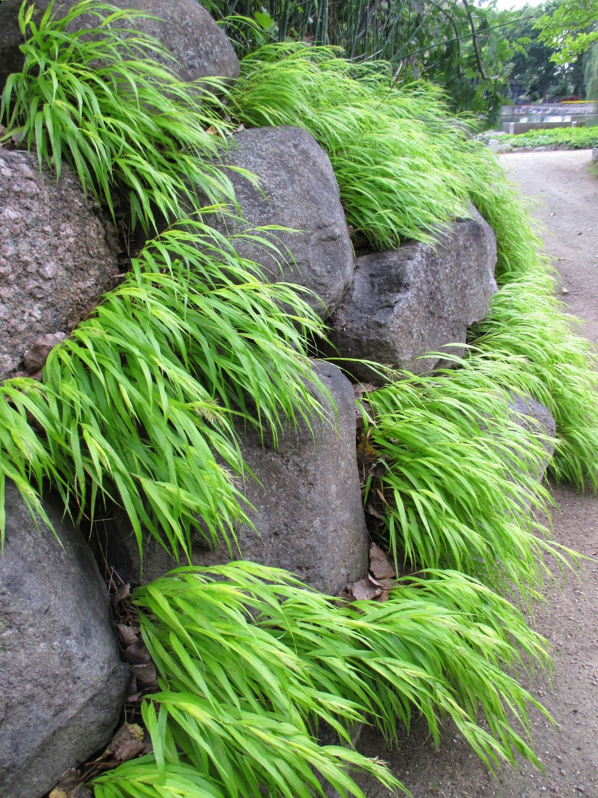 'All Gold' Hakone grass (Hakonechloa macra) flowing out of our boulder wall - perennial