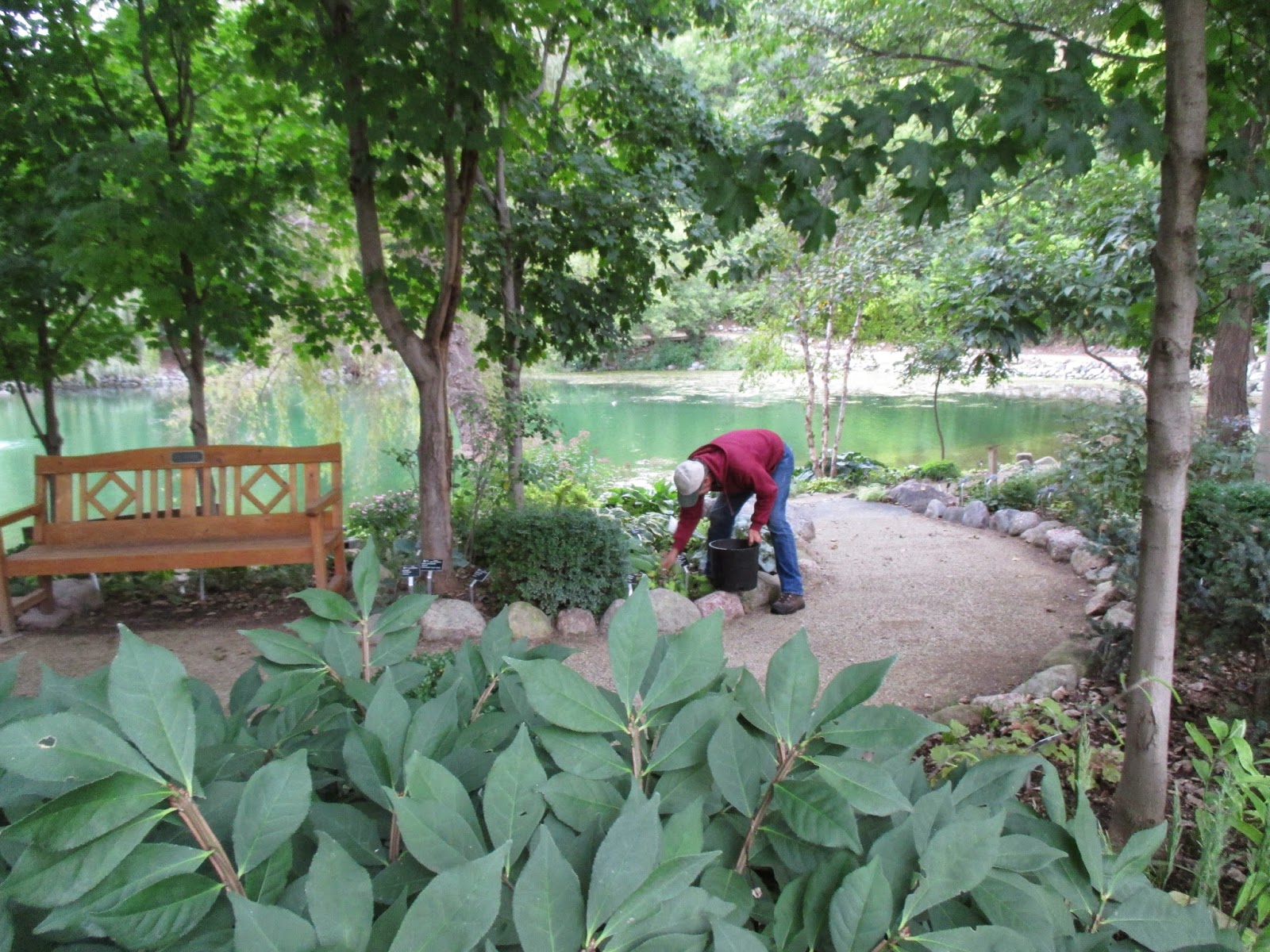 Our grounds crew had a productive day with outdoor activities until lunch and then a shift to more inside work as the drizzle continued. Cindy worked on tidying up in front of the Parker Education Center and did some work near the gazebo garden. She also shifted to lights testing which is one of the early preparations for the Holiday Lights Show that we like to tackle during these rainy days. While Terry helped with the lights after lunch, he had a busy morning of push mowing, shearing, weeding and other gardening duties. Janice helped with the plant sale but also worked with John (above) in the Thomas Jefferson Collection. Janice also did some gardening and worked on the cutting display. I had various tasks including some preparations for upcoming presentations and the Holiday Lights Show. Below are some additional images from today.