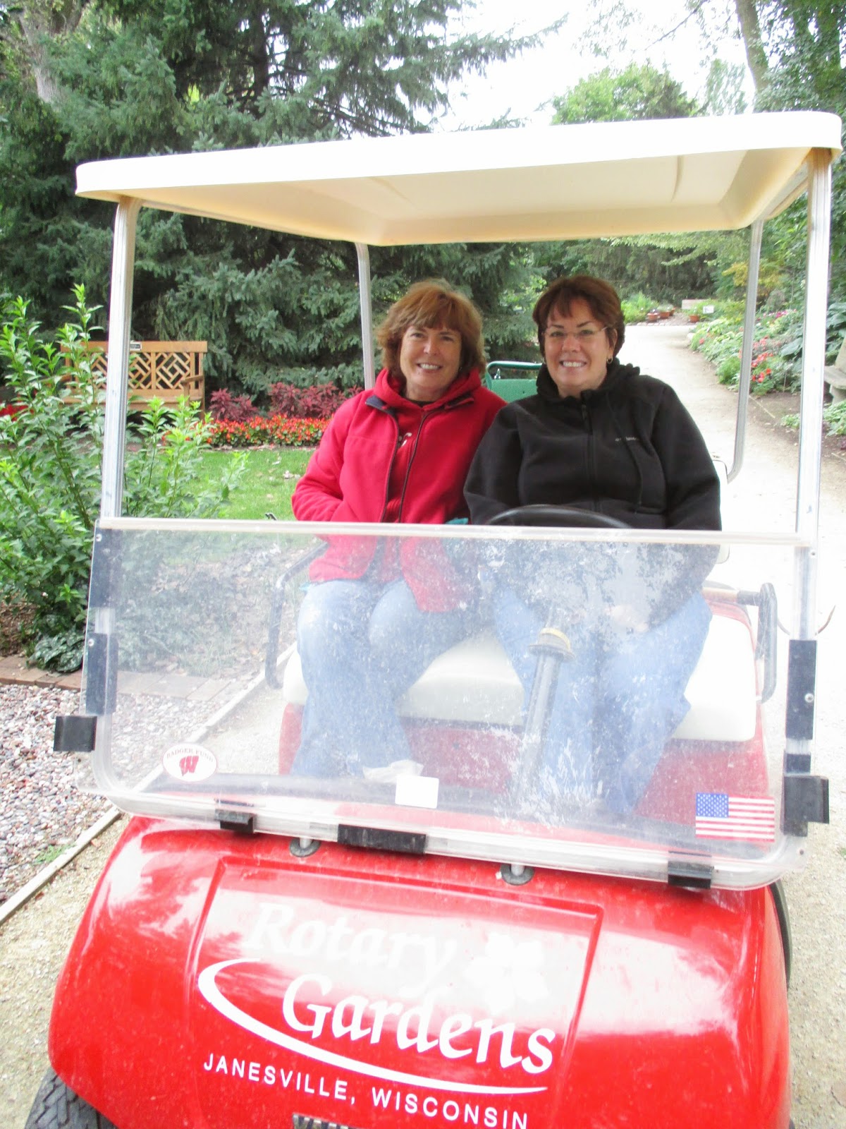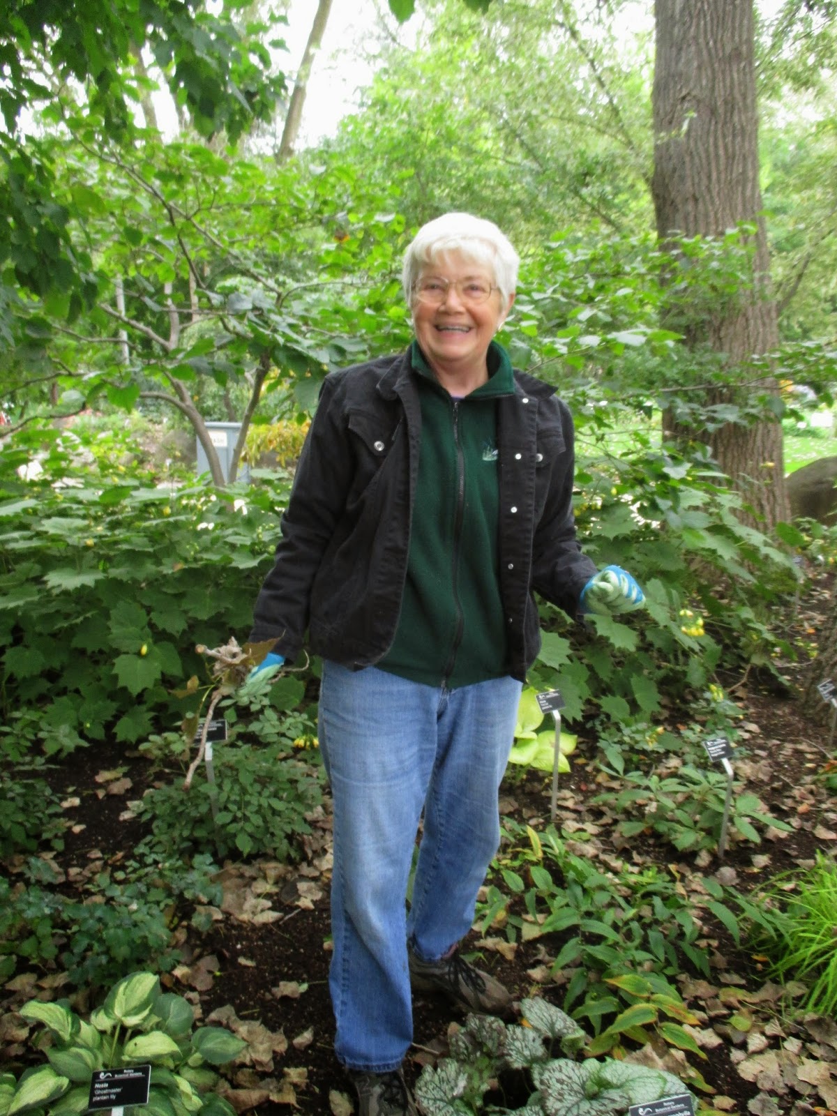 We had a great showing of volunteers this morning and were able to get the gardens tidied up for the weekend. The weather will be cool this weekend but tomorrow looks nice for the Fall Plant Sale Extended Clearance (9 am - 2 pm, 15% off everything) and three outdoor weddings. Above is Ron K. collecting leaves in the woodland walk garden. He did a nice job but noted that about 75% of the leaves above his assigned garden have yet to come down! Below are Resa (left) and Cookie heading out to tidy the North point garden and areas surrounding that garden. They always do a nice job (of smiling too!). Kathy and Eva continued their work in the entrance garden and we'll be going through their weekly to tidy and purge as needed. The second photo down shows Kay working in her assigned section of the shade garden which had a fresh batch of leaves and twigs that didn't escape her attention. Dr. Gredler did his mowing rounds and we had help from new volunteer John (third photo down) out in the gardens. We also saw Dr. Yahr, Maury, Bonnie, Fred S. and many others today.