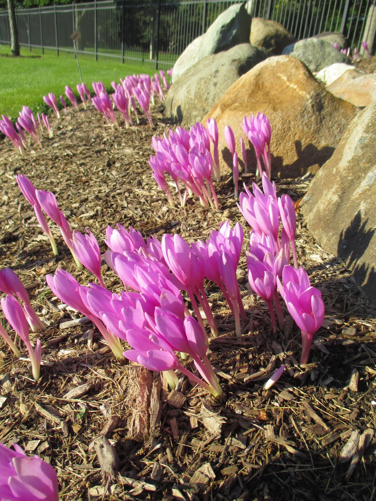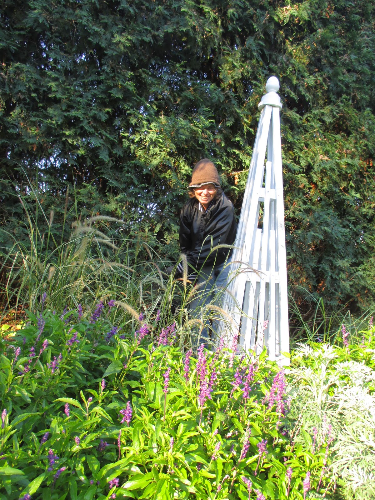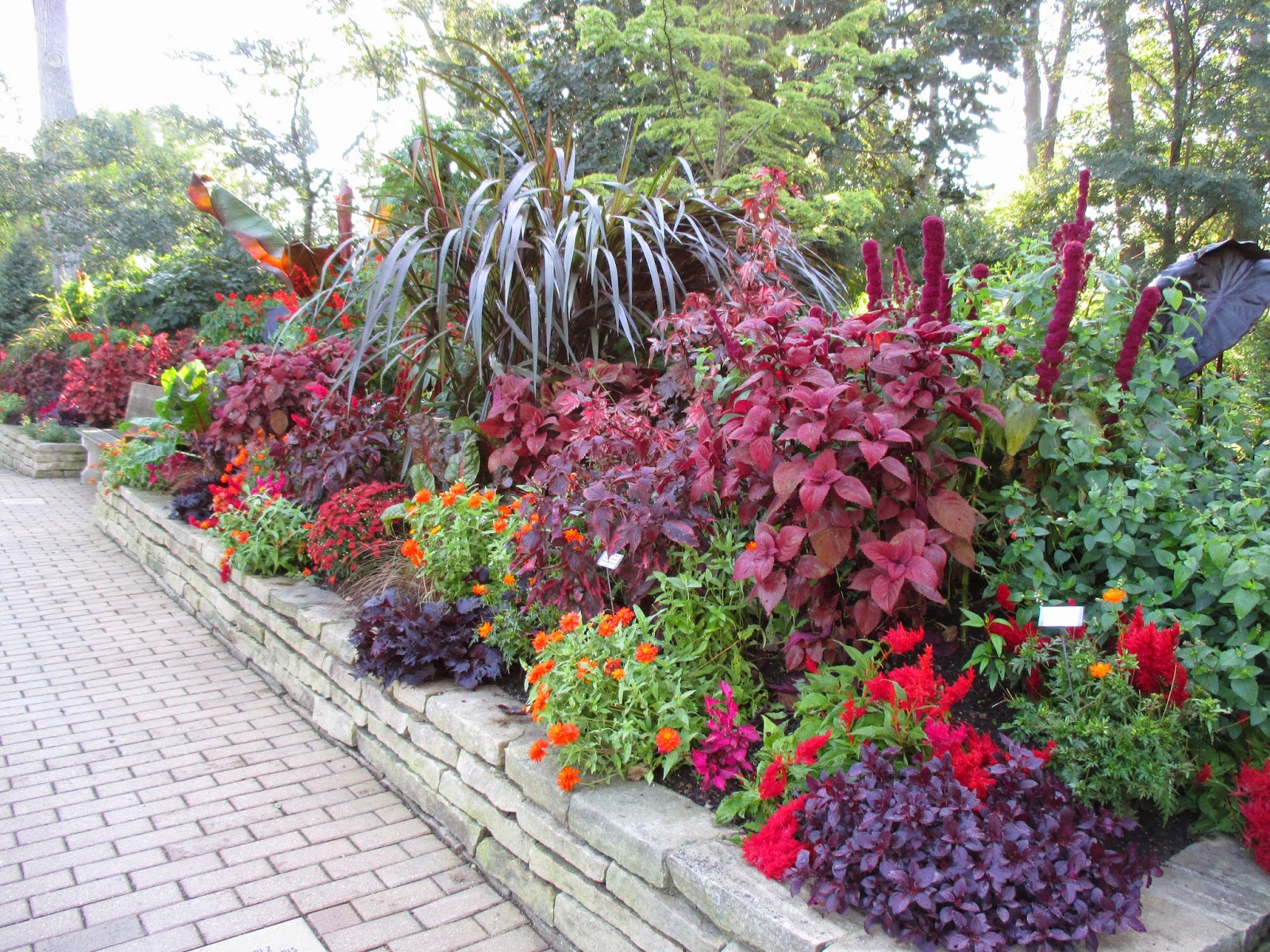This time of year provides countless tasks and our grounds staff dove right in early this morning. Cindy worked on hauling mums to the Parker Education Center (still for sale at $7 each, bulbs for sale inside too!). She also worked on mum planting in the Nancy Yahr Memorial Children's Garden along with some additional clean-up. Cheryl continued tidying in the gazebo garden and English cottage garden. She also had some major watering duties in and around our holding yard. Big John and Terry picked up some donations today and worked together on many projects such as hauling in more lights for testing, preparing a greenhouse for winter storage of tropicals, etc. The guys also ran irrigation, set up strategic sprinklers and checked all the containers for watering needs. I had a brief presentation and continue to work on post plant sale duties and pre Holiday Lights Show tasks. Below are additional photos from this morning out in the gardens.