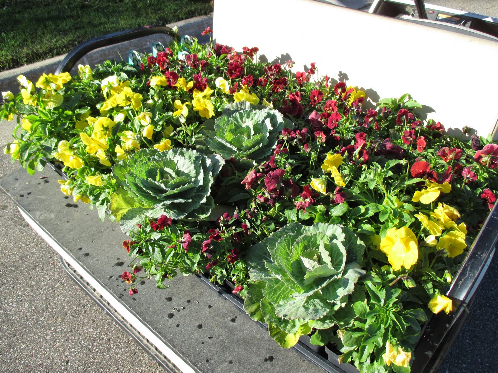Today was an absolutely perfect fall day with morning dew and temperatures right around 40 degrees F. It warmed up nicely to 65 degrees F and was a sunny day with blue skies. I could live in this weather year round for sure! The gardens have avoided frost thus far although we're poised to start removing tropicals for storage once we start heading in to early October. Wisconsin weather can be quite variable with our first hard frost coming between late September and early November (average around October 15th)....you never know!.... Above is a fortuitous combination of goldenrod (Solidago sp.) arching in to a 'Shockwave' variegated garden phlox (Phlox paniculata). Below are some of the plants being installed for fall interest over these coming weeks. These pansies (Viola) and kale (Brassica) are destined for the English cottage garden and will fill gaps created by annuals that are being removed. We had a great crew today of both grounds staff and industrious volunteers! Below are some additional images from today...