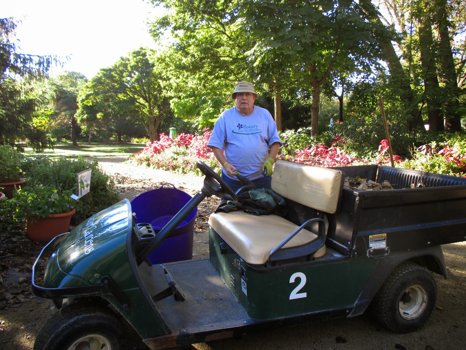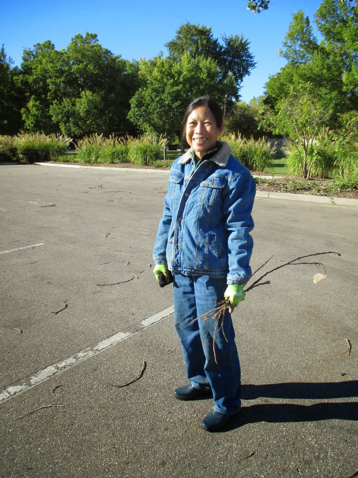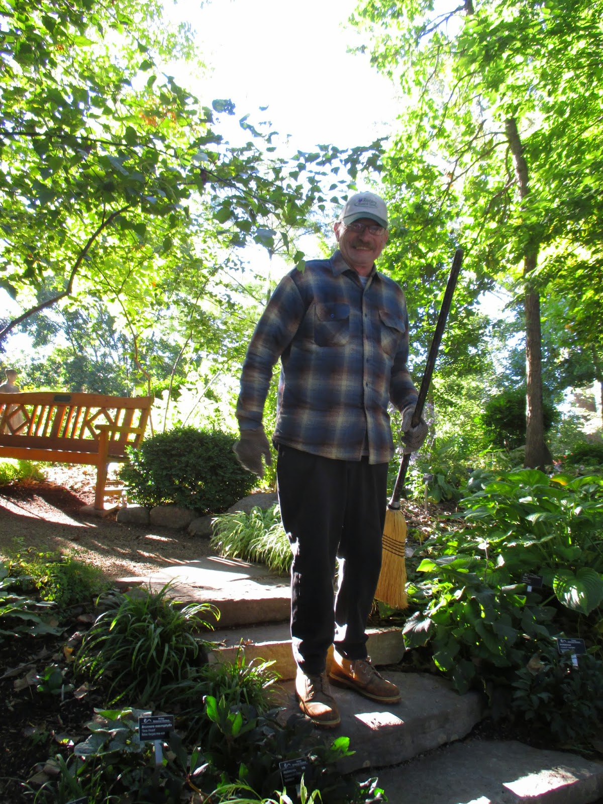 There were plenty of gardening duties out in the gardens and most of the Grumpies (like Ron B. above) helped with garden clean-up. Ron B. worked with Ron R., Gary B. (below) and Larry H. on leaf collection along our paths and in many of the shadier areas where the cottonwoods (Populus deltoides) are dropping leaves en masse. The second photo down shows our newest gardening volunteer Fran who worked with Kathy (third photo down) and Eva in the entrance garden with tidying efforts. The ladies did a great job out there. Dr. Gredler was in for mowing and our carpenters (Dave, Jim and Bob K.) had their share of tasks both inside and out. The fourth photo down shows Del starting to work on his deer cutouts that will ultimately be part of the Holiday Lights Show. Gary S. was in for label making early this morning. The fifth photo down shows Patrea and Ron P. working with Pat M. on lights repair which is tedious but essential. Urban came in this afternoon to trim back some roses along our Palmer Drive bed. We also saw Rollie, Jumbo Jim, Bill O. and many others today.