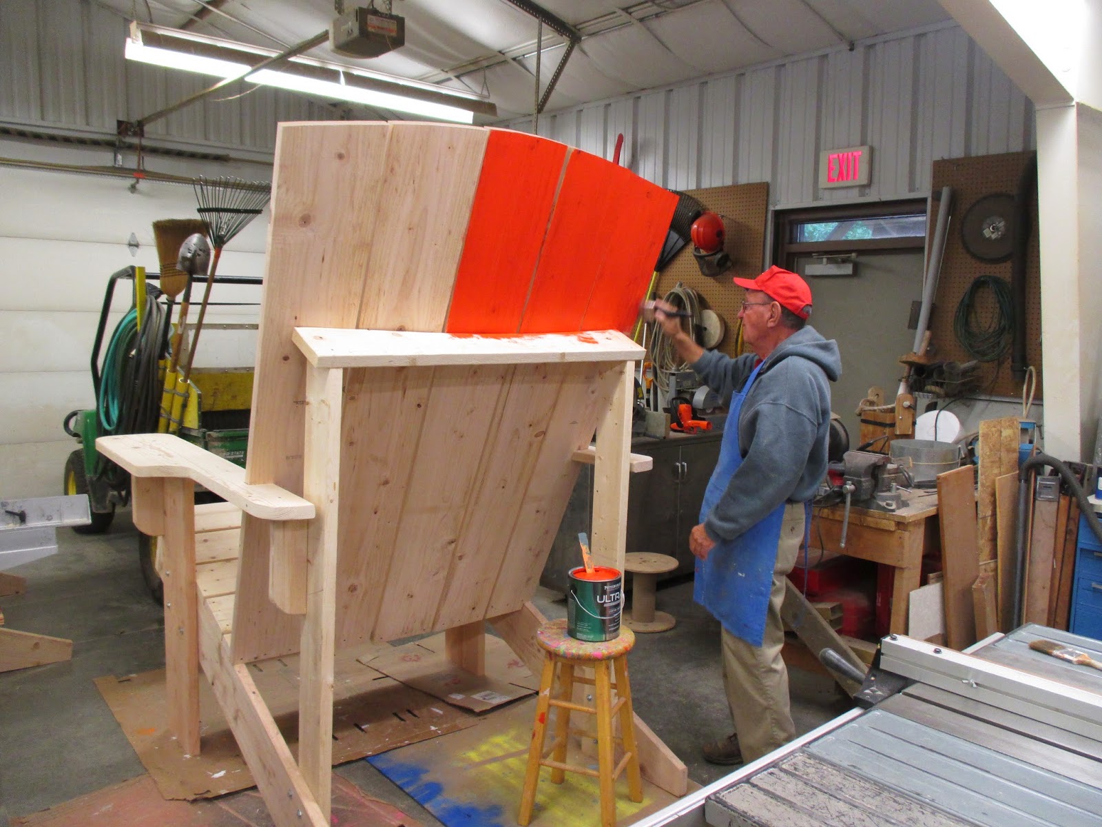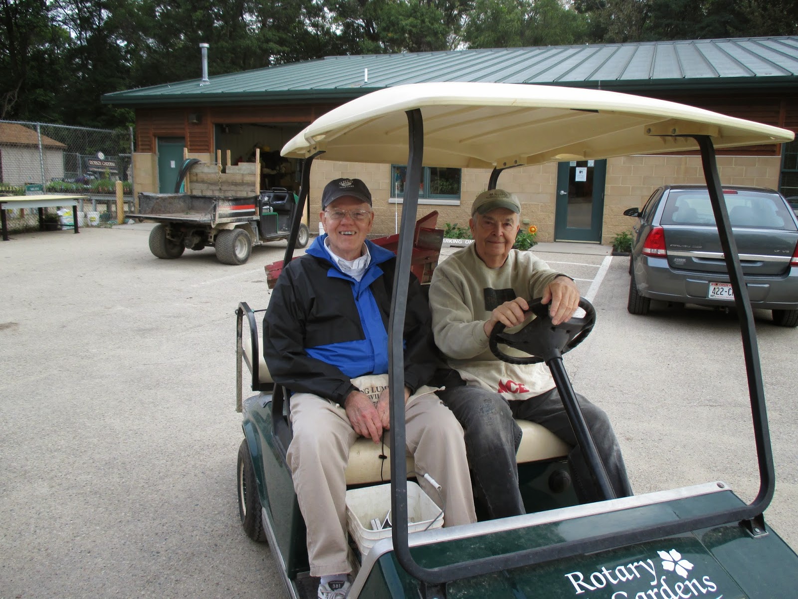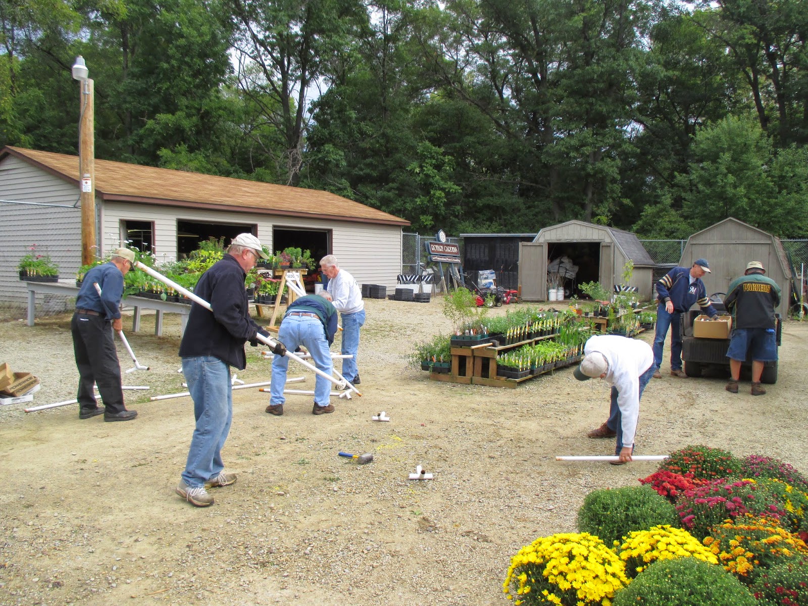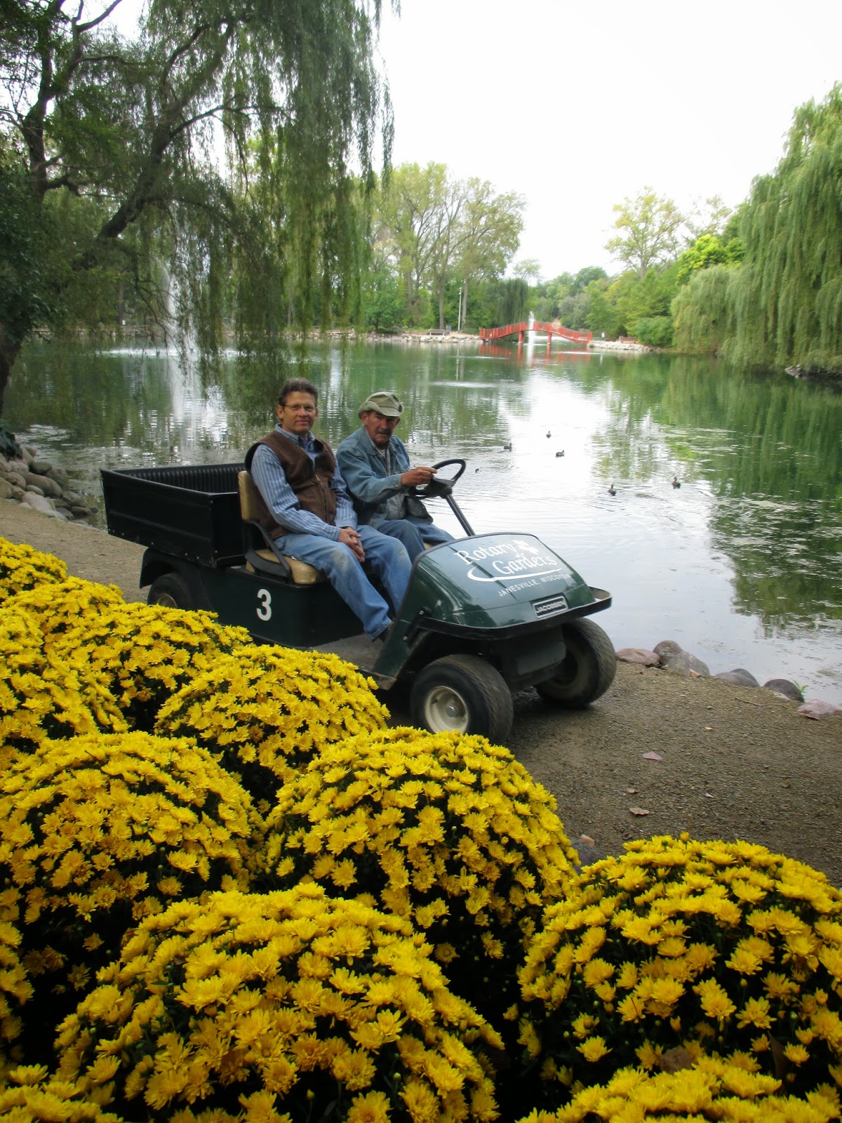 The Grumpies above (left to right are Dick H., Ron R., Dick P., Gary, Lloyd, Larry H. and Gary B.) took down our large plant sale tents in quick order and some of the guys continued working on dismantling some of the plant sale tables. Larry H., Lloyd, Ron P. and Gary B. were also out collecting leaves and debris off the paths. The carpenters (Jim, Dave and Bob K.) headed out to work on a siding project and Ken (below) started painting our giant Adirondack chairs. The third photo down shows Dave and Jim (driving). Bob also had some other projects including electrical troubleshooting with Larry (see second photo down). Shirley, Kay and Eva all worked on tidying up the entrance garden and purging spent annuals. They came back with plenty of loads of debris. Maury ran more errands and helped haul mums up to the Parker Education Center for purchase. Del helped water the mums and we also saw Dr. Yahr, Bill O., Rollie and many others today.