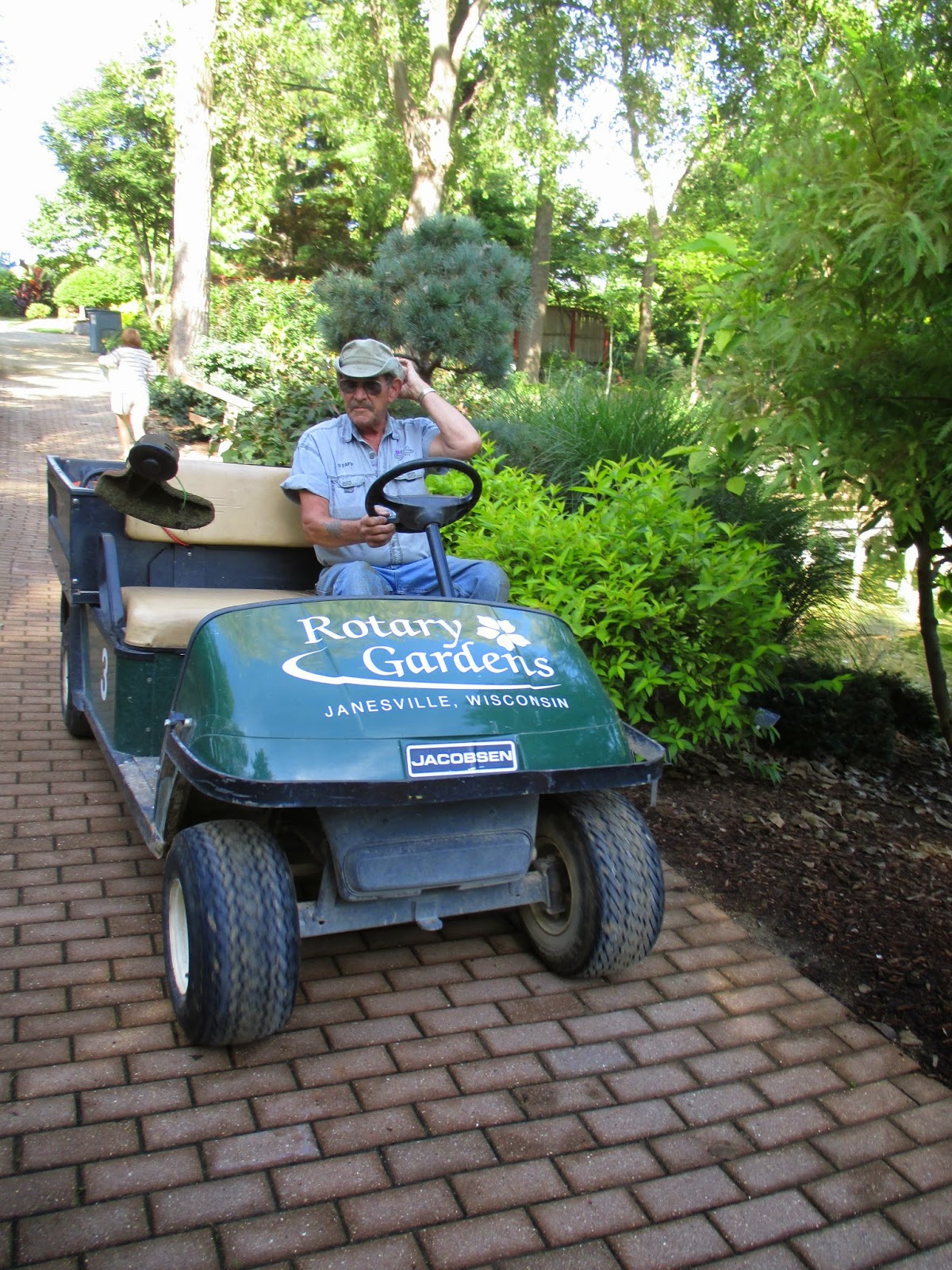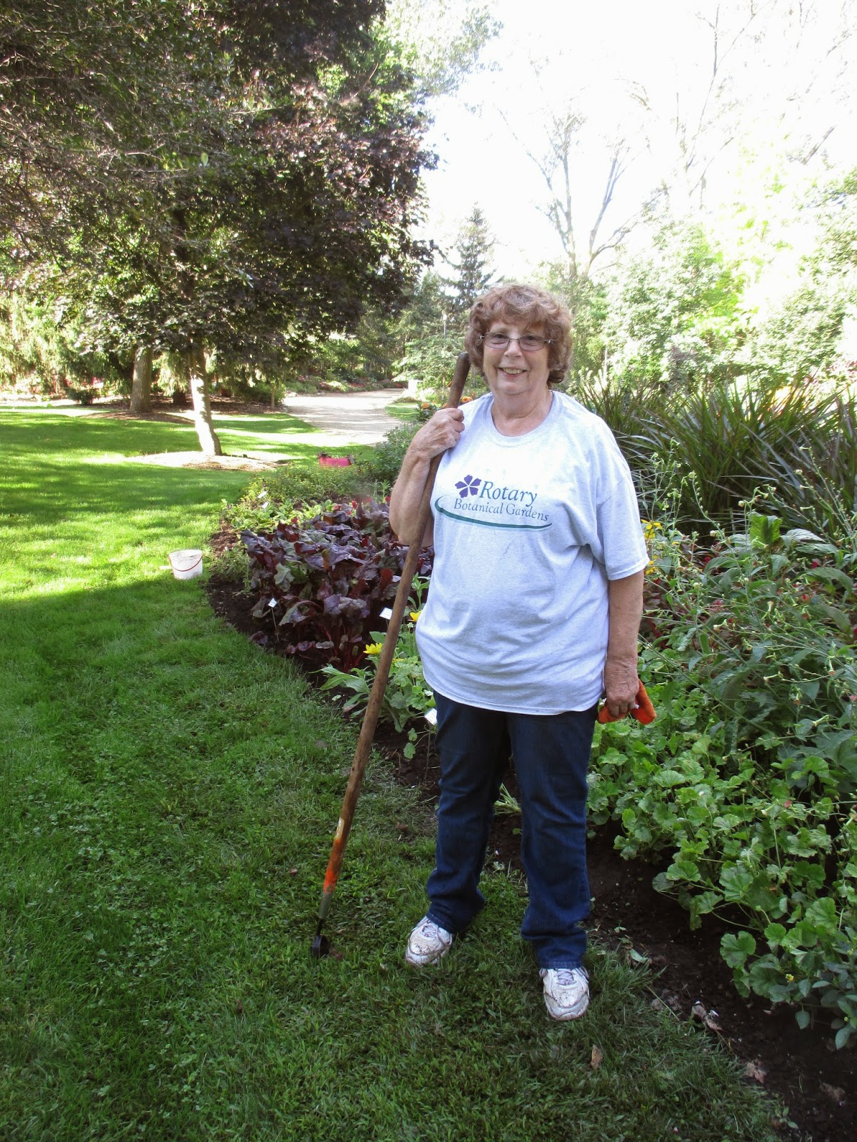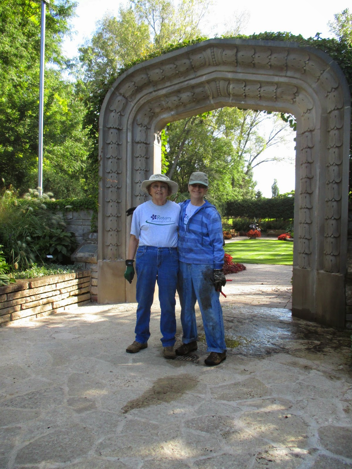 We had a great turnout for volunteers today. Above are Gary (left) and Bob C. collecting leaves near the gazebo garden and Shirley (directly below) was in the vicinity cleaning up her garden space. We're starting to remove spent/unsightly annuals here and there but do our best to maintain color through September. The second photo down shows Shirley (left) and Patrea near the archway (from the original Parker Pen Company world headquarters) leading from the reception garden to the sunken garden. The ladies did a nice job tidying that space and continued down in to the sunken garden where Kathy (third photo down) and Eva were working. This quartet shifted to other areas as well. Our carpenters (Dave, Vern, Jim) kept busy with carpentry and new Grumpy Ken did some nice chair painting and helped the guys out. Bob K. had various tasks including significant preparations for some looming work in the Nancy Yahr Memorial Children's Garden. The fourth photo down shows Ron P. who worked with Lloyd on additional leaf collection around the gardens. Del did some watering for us as did Ron and Bev W. in the afternoon when they watered our plant sale mums (still available at 15% off!). Gary S. and Dick H. delivered some of the Adirondack chairs that were auctioned off yesterday to bring closure to our 2014 Garden Art Project with all 25 chairs going to good homes. Gary also collected leaves and Dick had a run to the dump. Dr. Gredler did his mowing and we also saw Bill O., Rollie and many others today.