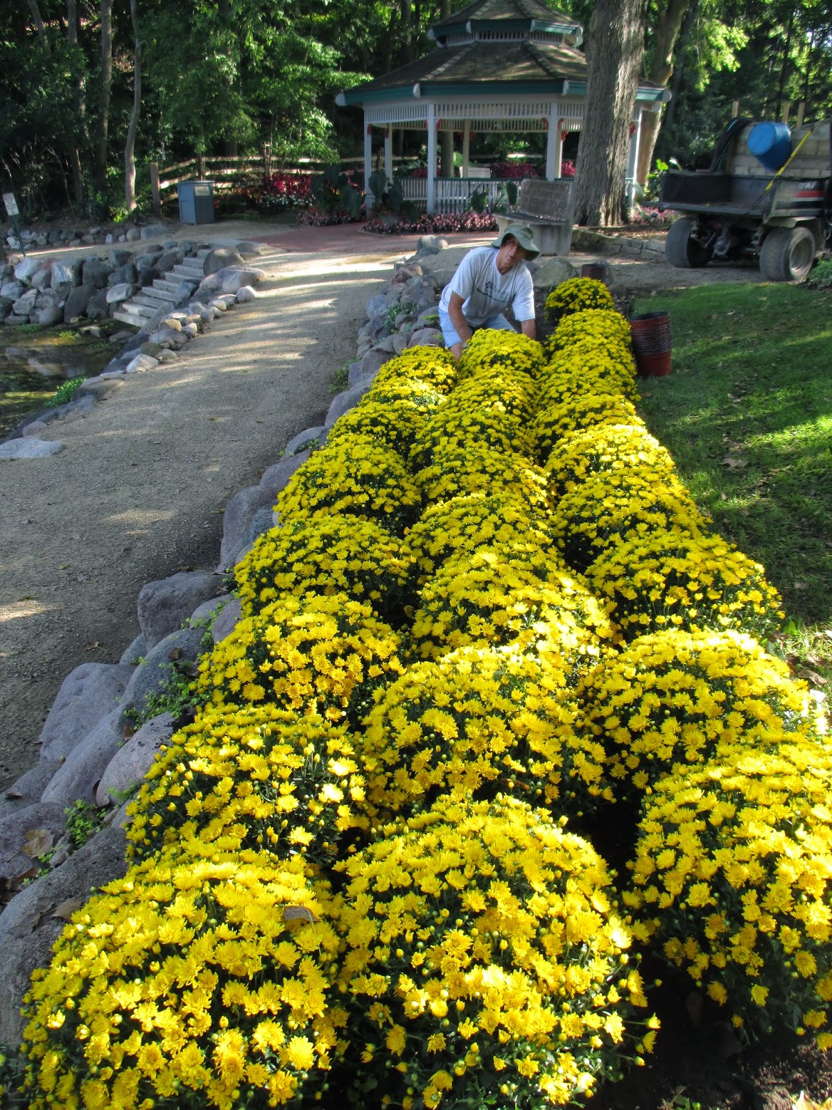 The grounds staff had a busy day out in the gardens. Above is Big John converting containers to the fall display of mums. John also worked on watering and other tasks throughout the day. Terry (directly below) also planted quite a few mums as seen here but seemed a bit put out when I told him that they should all be orange.... Terry also worked on watering, shearing and other tasks. Cindy had a full day of garden clean-up in three different garden areas (entrance garden, larch wall border and Nancy Yahr Memorial Children's Garden). Larry (second photo down) ran irrigation, mowed and did quite a bit of weed whipping. Janice was in to get the plant sale in motion and came back later to close it down. I helped with the sale but was able to get out in the gardens briefly (see additional photos below). It was a good day and we hope to sell plenty of more plants yet this week (9 am - 2 pm, Tuesday thru Saturday).