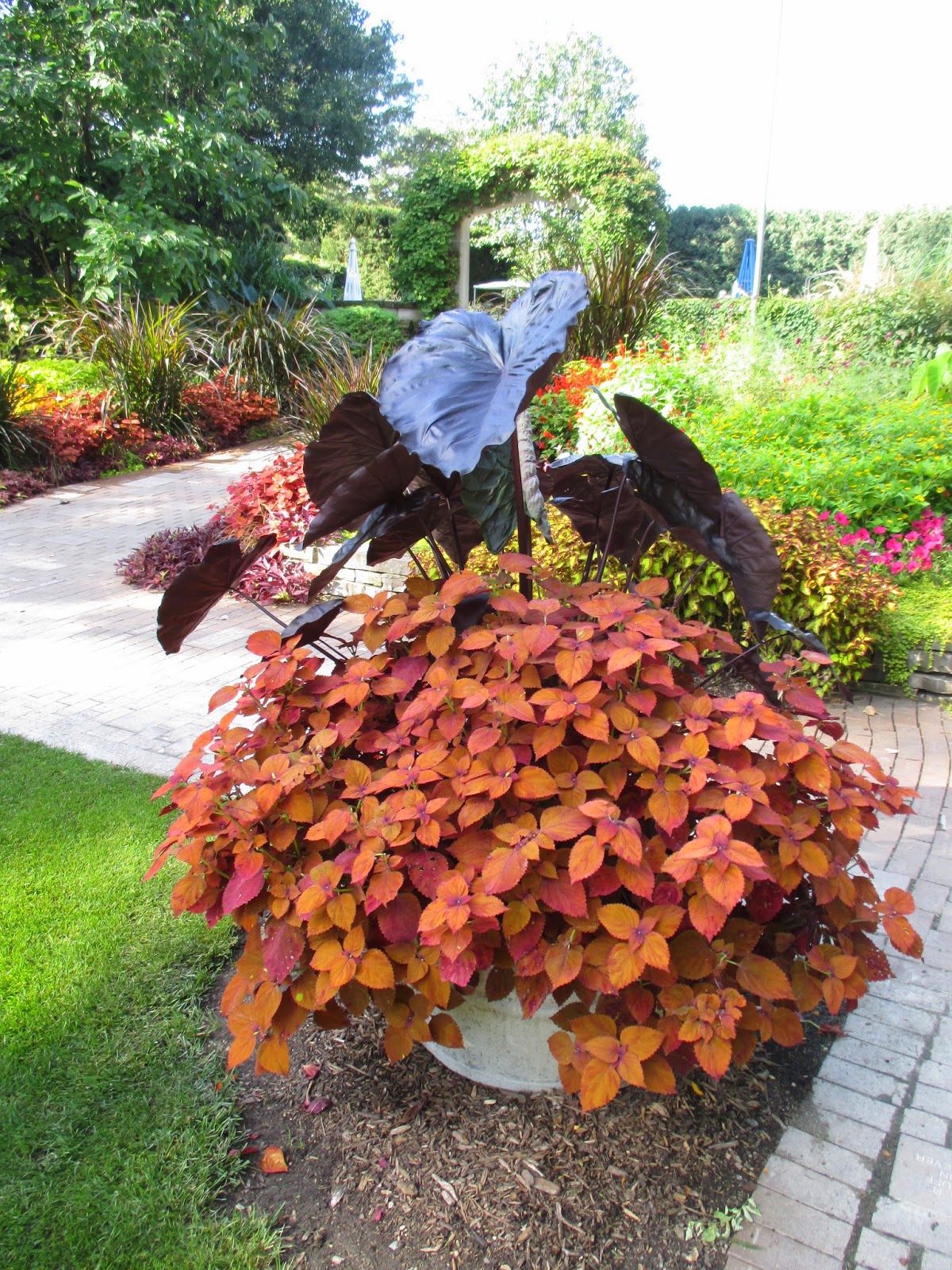 'Saturn' coleus (Solenostemon scutellarioides) in the gazebo garden in this colorful border