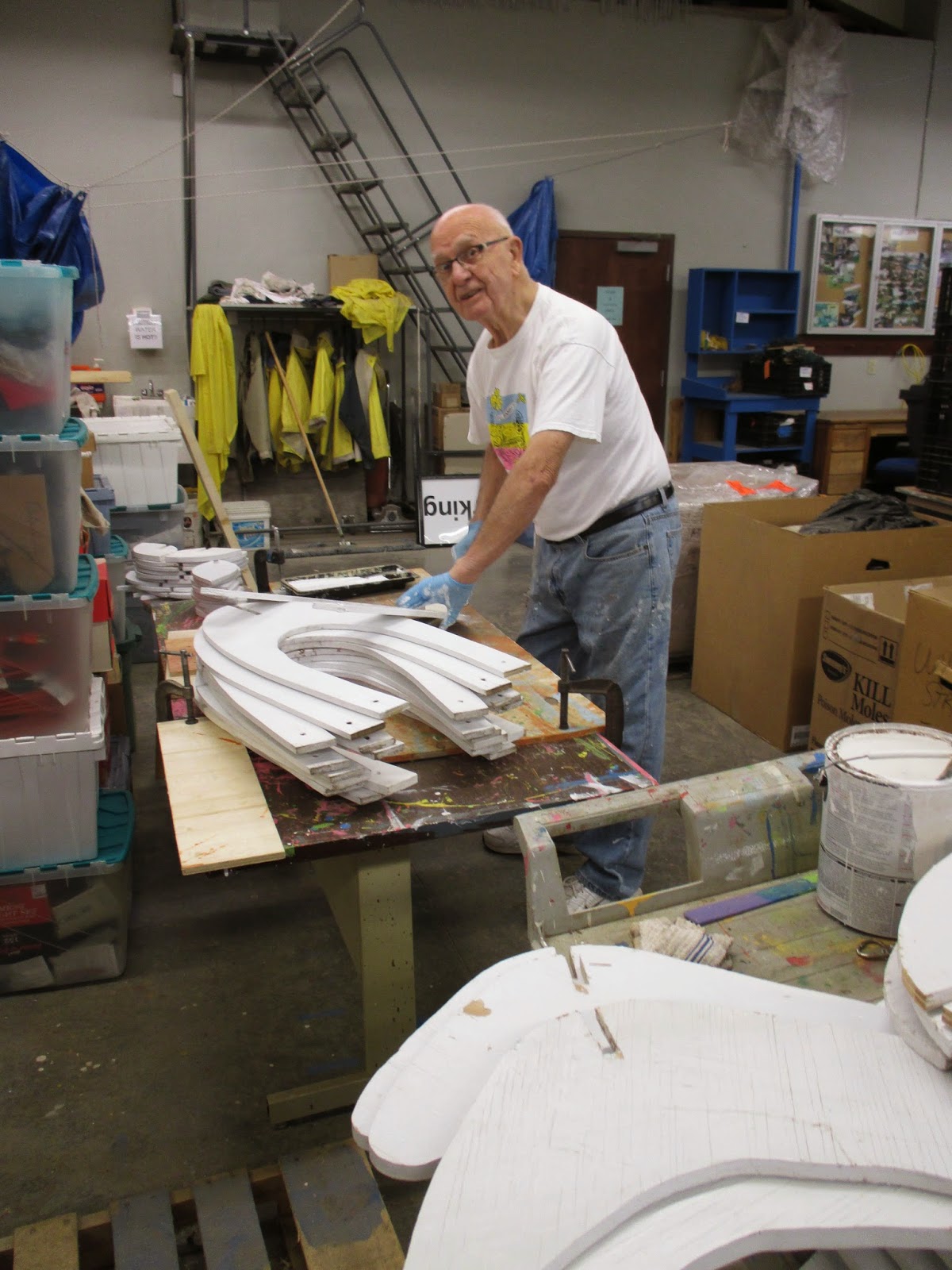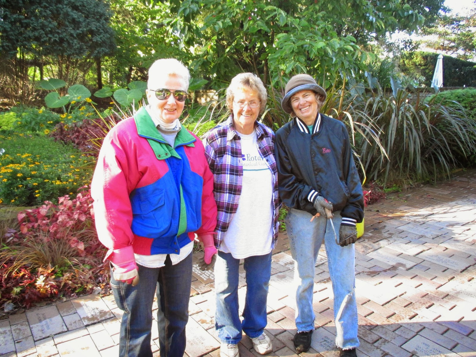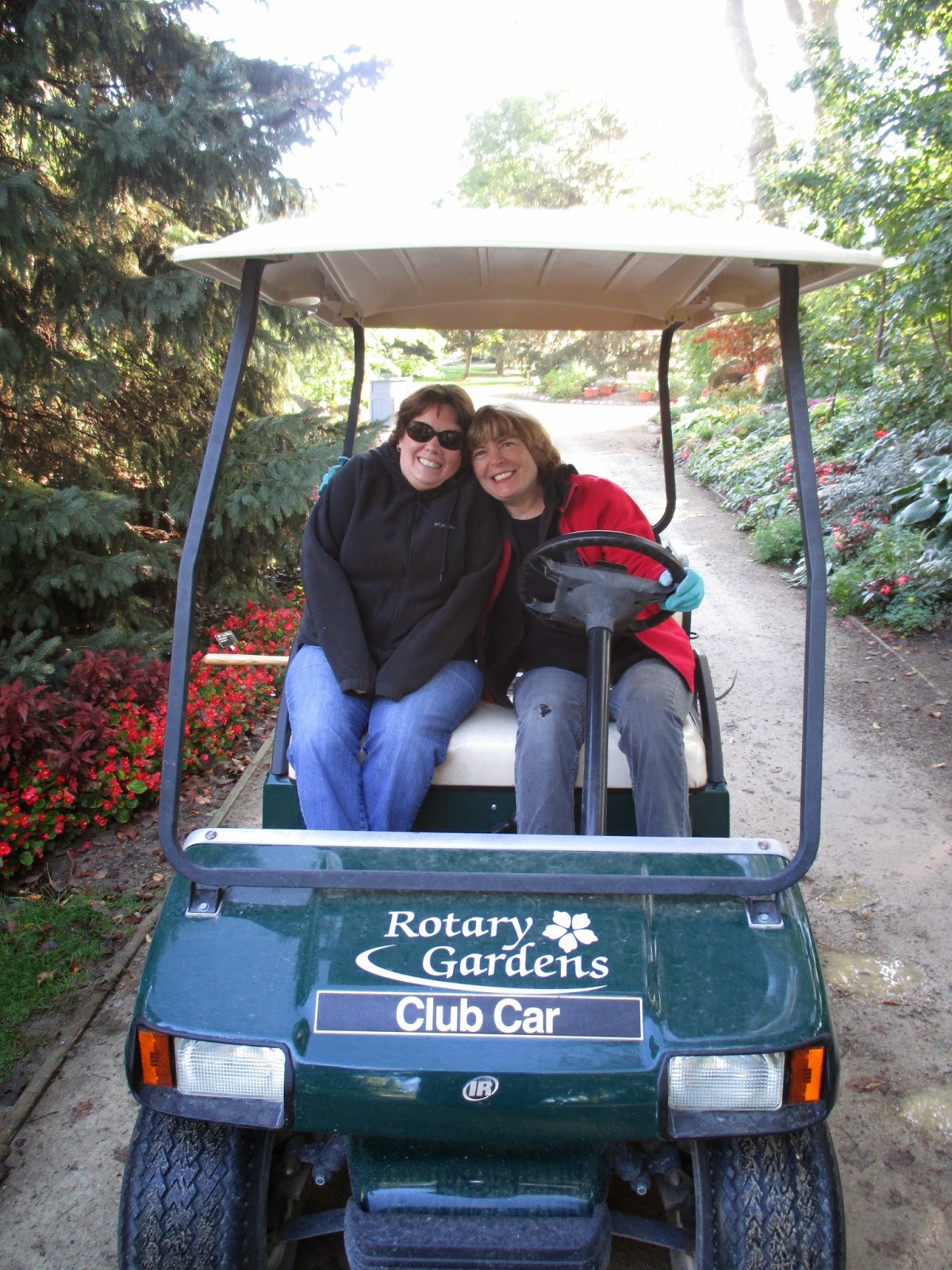 Our volunteers were all dressed in layers this morning but it warmed up nicely. Above (left to right) are Peg, Kathy and Eva. This trio did a nice job removing spent annuals (primarily coleus) and installed mums for quick color in the sunken garden. With more weddings over the coming weeks, we try to maintain and augment color throughout the gardens. Cookie and Resa (driving) below did similar work in the North point garden which is their assigned garden area. They did a nice job and that garden continues to look very showy. Vicki came in to help Janice with gardening tasks and Bill O. did his mowing rounds. Jumbo Jim and I did a tour of the Japanese garden to identify fall/winter projects and Shawn W. was in that area cleaning up the water features. Del (second photo down) continued work on his reindeer cutouts for the Holiday Lights Show and both Bev D. and Deb G. were in for some meetings and other tasks. We also saw Dr. Yahr and some others today.