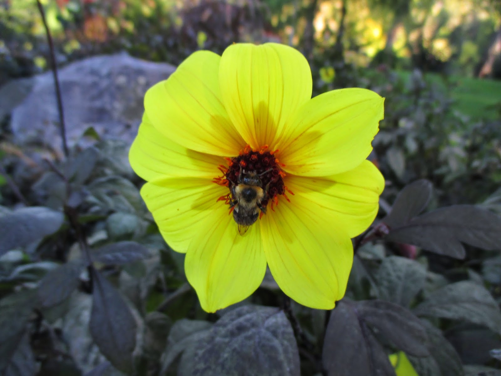 'Mystic Illusion' dark-leaved dahlia (Dahlia hybrida) - annual (one of the most popular in the gardens this year...note the bee in the middle too!)