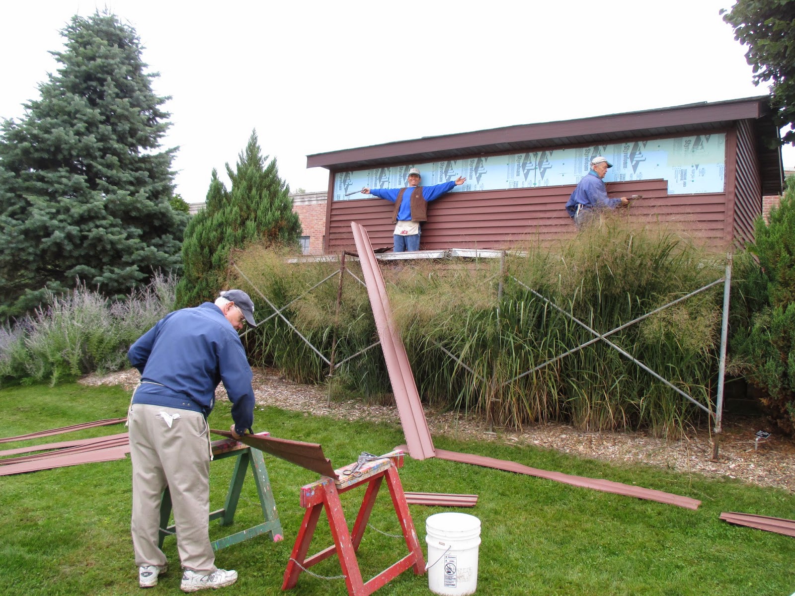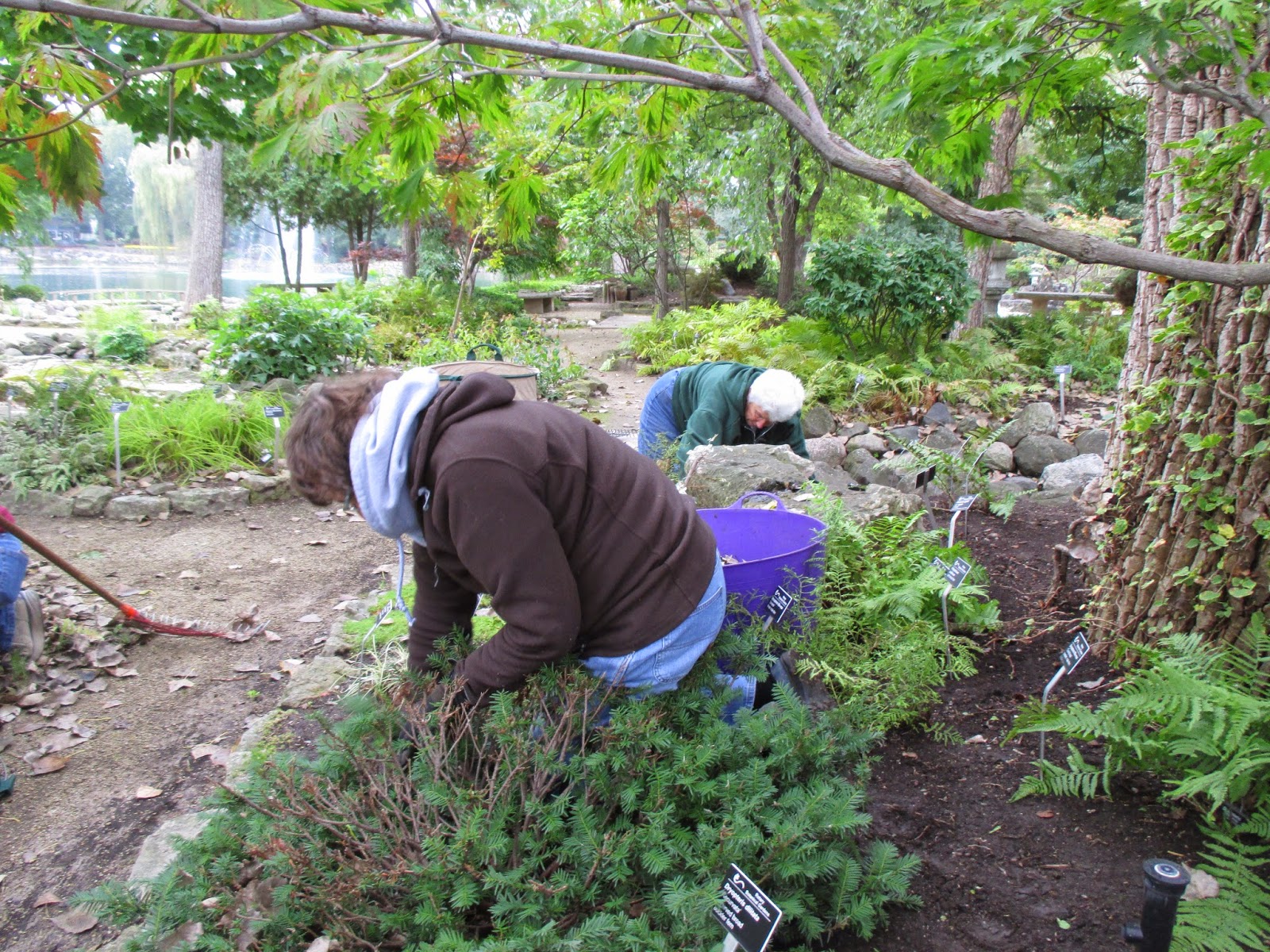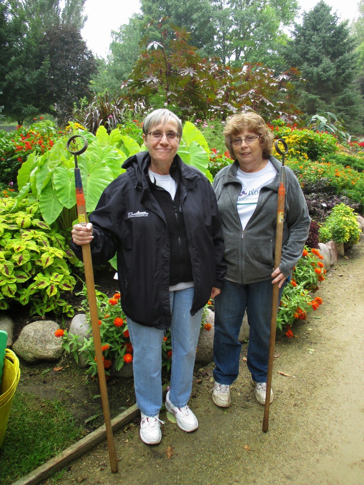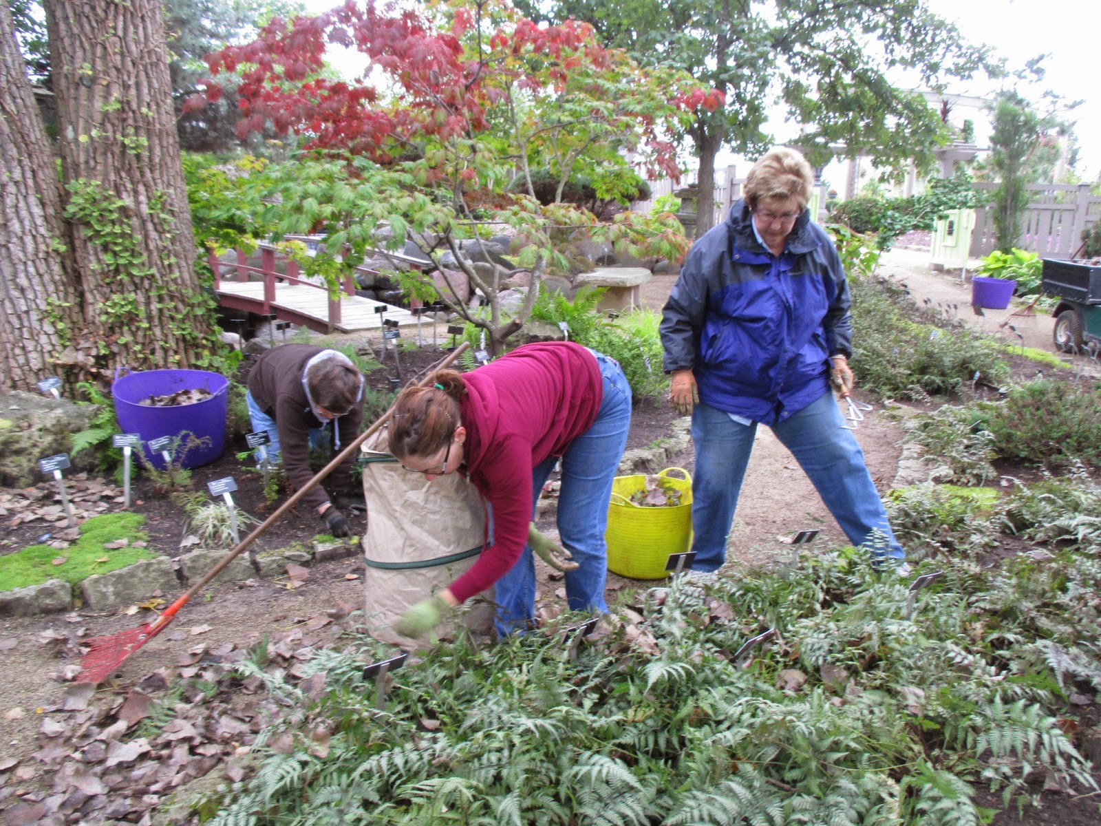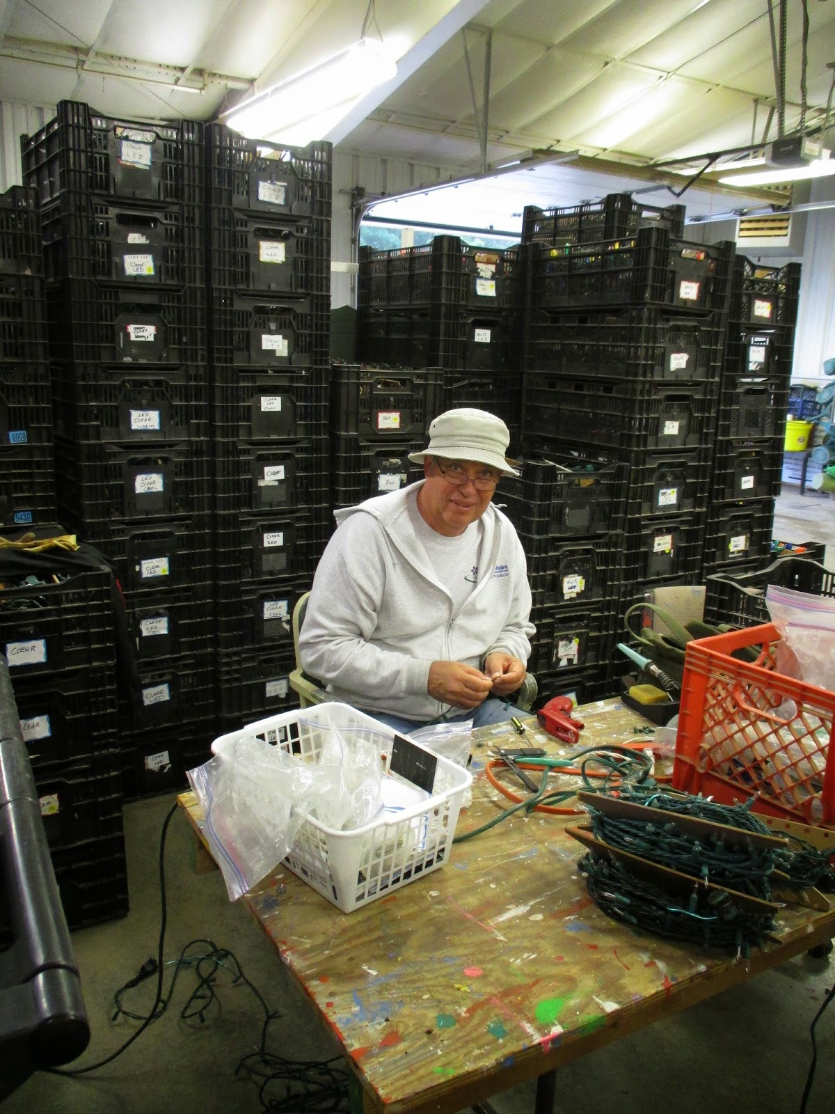 Ron P. above was working on repairing lights for the Holiday Lights Show and was pleased with his progress until I pointed out the crates behind him still needing his attention! We had a wonderful turnout of volunteers today with a strong focus on outdoor work. Ken was inside painting our giant Adirondack chairs and Dr. Gredler came in for late morning mowing. Directly below are Betty (left) and Shirley before they descended on their respective garden areas for "purging" of spent annuals. They did a great job. The second photo down shows Larry H., who along with Ron R., did a nice job collecting leaves in various locations. I told Larry that I was going to show his wife Amy this photo of him with another woman...Gary B. watered mums and really helped out in the yard with some final Fall Plant Sale closure. Dick H. made some runs to the dump due to all the debris we're accumulating while Dave, Bob K. and Jim D. worked on a siding project (third photo down). Kathy and Eva (fourth photo down) did a nice job in the sunken garden with removing some unsightly plants and installing mums for extended color. They are a great team and will continue working in that space tomorrow. Mary Ann (fifth photo down) watered and tended the Thomas Jefferson Collection which is still looking good as we head in to Autumn. Hal and Doris came in to work in their area which included removals and mum additions. The sixth and seventh photos down show the elite team of Bonnie, Suzie, Mary R. and Sue C. collecting leaves and debris in the fern & moss garden. The ladies were very thorough in a space that really needed their collective attentions. We also saw Dr. Yahr, Joe V., Charlotte and many others today.