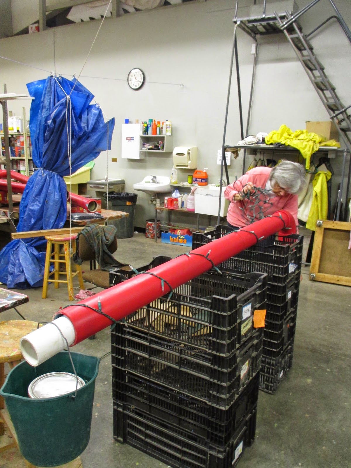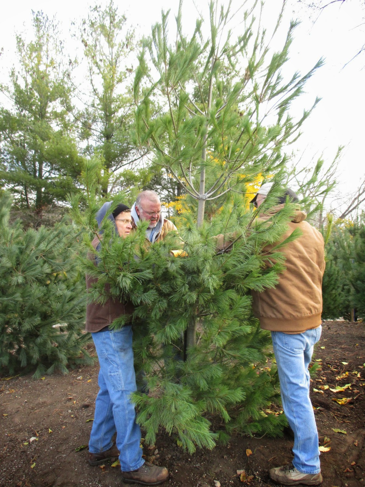 The grounds staff had a busy day for sure. We had some indoor projects and ultimately everyone ended up outside. Directly above is Cindy working on packing up our cannas for winter storage. We've been drying them recently and will have volunteer "babysitters" keep them over the winter for replanting in early April of 2015. Cindy also helped with some HLS lights work on candy canes (with Nancy) and was out stringing the lights for the half gallon milk jug luminaries. Pat (two photos directly below) finished up efforts on this "Tower of Power" which has close to 2,500 blue LED lights on it. He's done a nice job with both towers and he came in late yesterday to anchor this structure against the aggressive winds last night and today. The third photo down shows Terry, Big John and Bob K. (volunteer) working on securing trees for the HLS. These are the donated trees we picked up yesterday and once in place, they'll all get a healthy dose of lighting. Bob K. was a huge help today. John and Terry also hauled out some other displays and HLS elements and continue to "live and breathe" this event daily. Janice had some indoor projects, helped Kris K. prepare for the Fall Symposium (tomorrow) and also strung some lights. I was "cord boy" all morning and caught up on other duties after lunch.