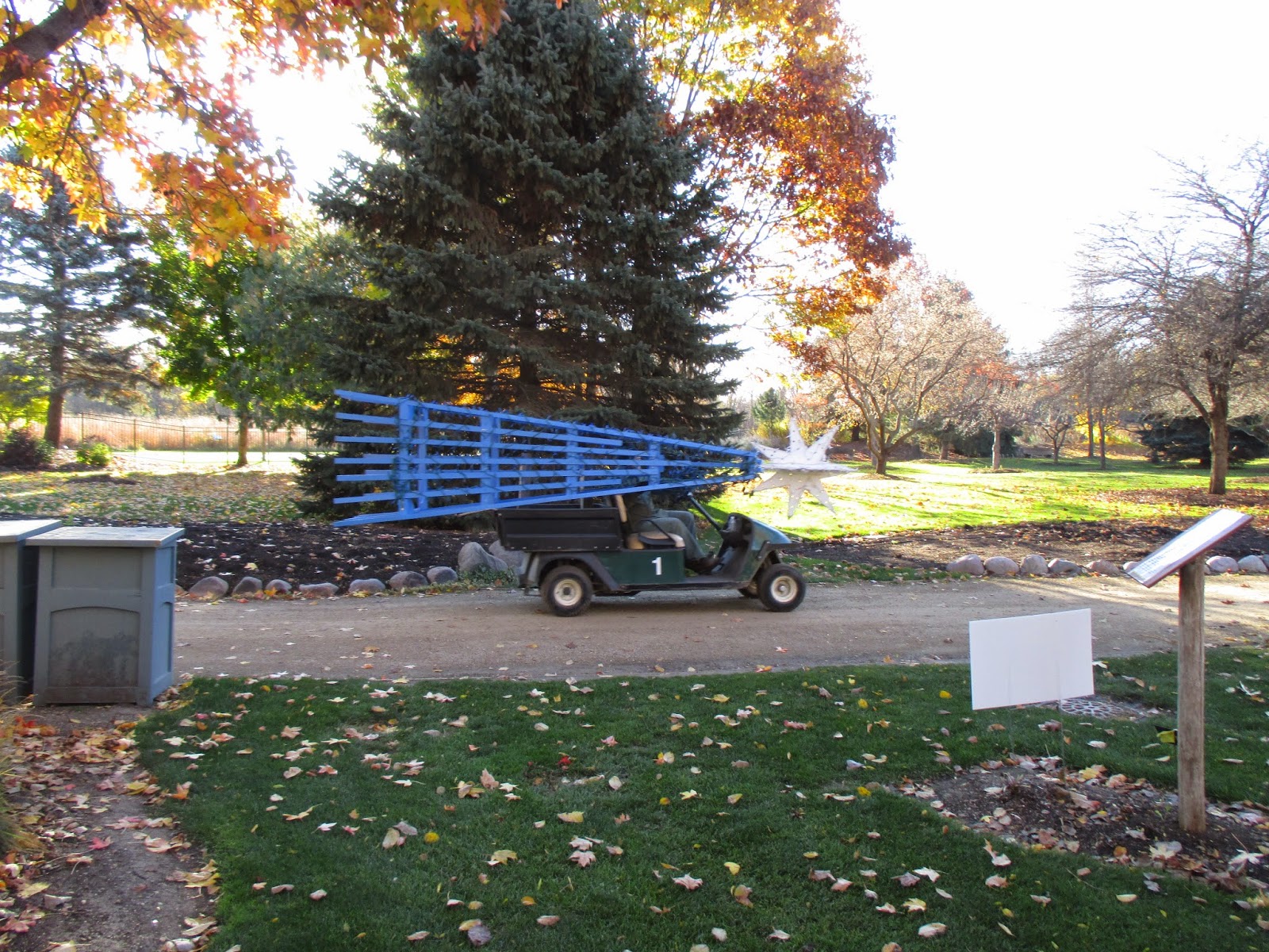 We had some stalwart volunteers today. Eva (above) and Kay (below) both worked on collecting debris from various garden areas. We are at least 83.5% done with fall garden clean-up and these two ladies have had an integral role in this progress! They brought back many loads of debris and fought the winds as best they could. Bob K. helped the boys with securing trees this morning and Dr. Gredler was out mowing. Nancy N. came in to put more lighting on our giant candy canes. We also saw Marv B., Urban M., Kris K., Roman and many others today. Further below are additional images from today.