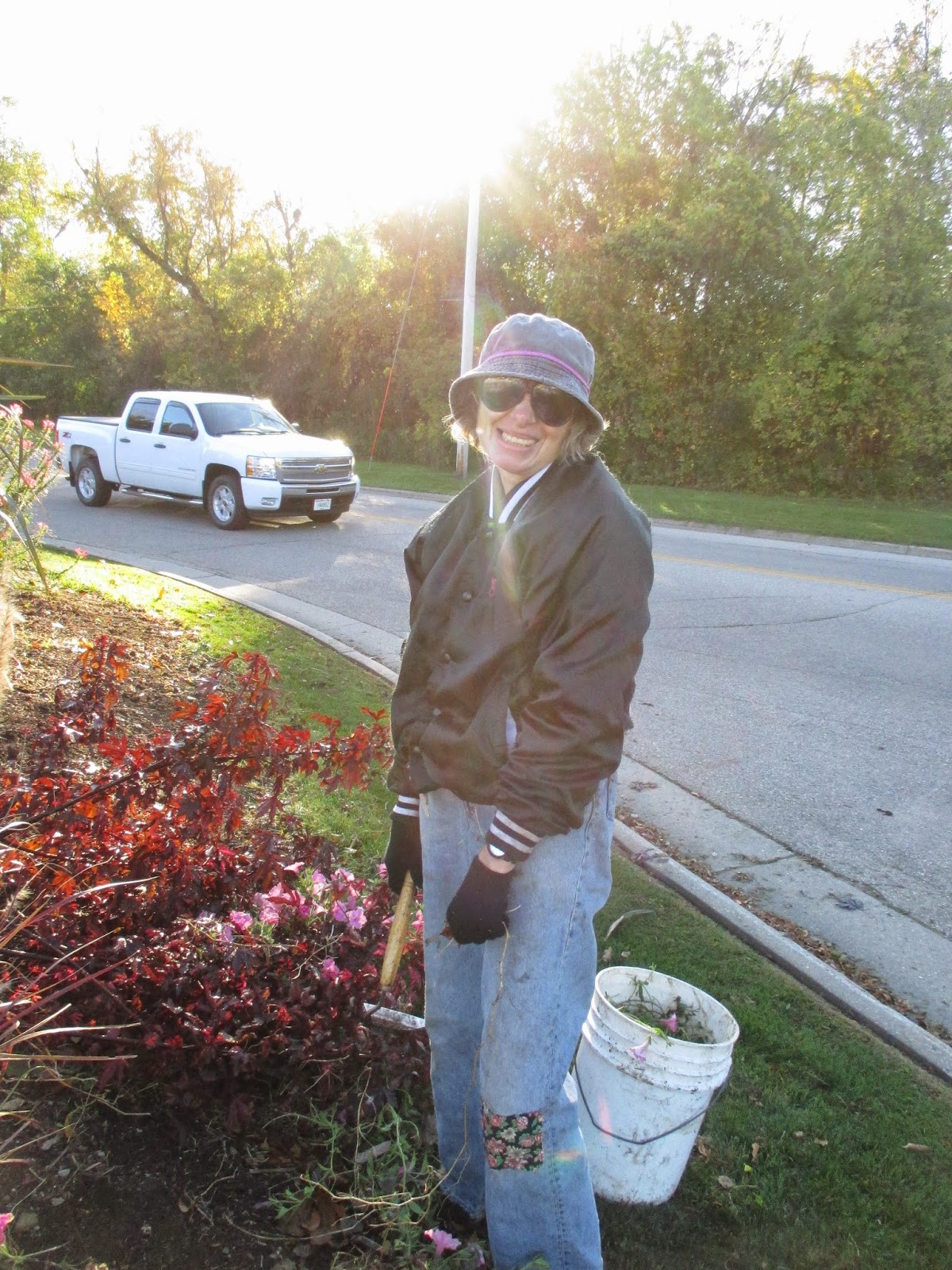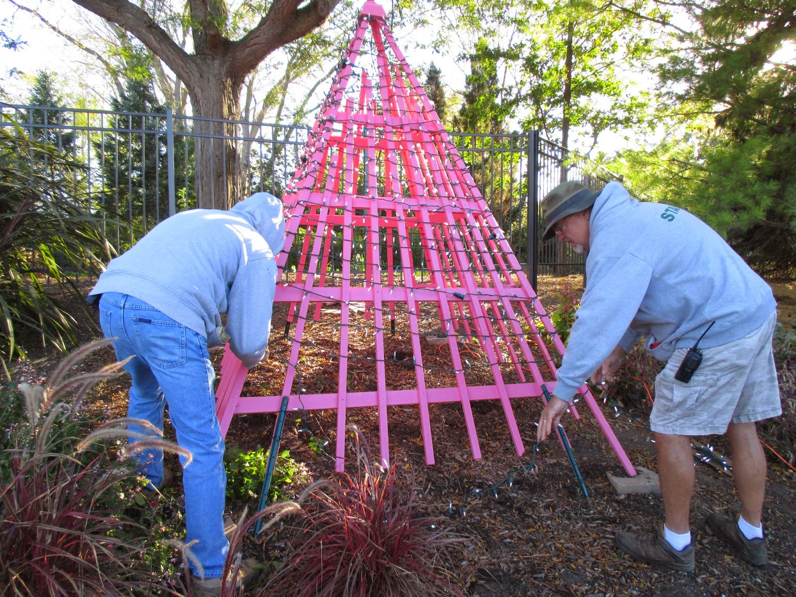 Today was not a 50/50 mix in terms of weather but of tasks. About half the work involved traditional autumn gardening (leaf collection, removing spent annuals, etc.) while the other half involved preparations for the Holiday Lights Show (HLS) which isn't really that far away on the calendar. Directly below are Terry (left) and Big John putting lights on one of three large pyramids in the entrance garden. Above is our front sign with the digital screen sharing that we are still "Celebrating 25 Years in 2014"! The year isn't over yet and either is the color. That bed (tidied by Cheryl today) still has plenty of color with 'Fireworks' fountain grass (Pennisetum x advena) in the foreground, mums and the dark maroon 'Vertigo' elephant grass (Pennisetum purpureum) in the distance. We had another great turnout of volunteers and it was a very productive day that started quite cool and ended up a pleasant 65 degrees F with a moderate breeze. John and Terry worked primarily on HLS work although they also had some odd jobs and watering duties. Cindy (half day) and Cheryl worked on gardening tasks. Cheryl and I went over to Green-Tek and BFG Supply here in Janesville for a great tour. It was nice meeting both Paul (President of Green-Tek) and Dave (Manager at BFG Supply) this morning and we enjoyed touring their operations and envision a long business partnership with both companies. Below are some additional images from today.