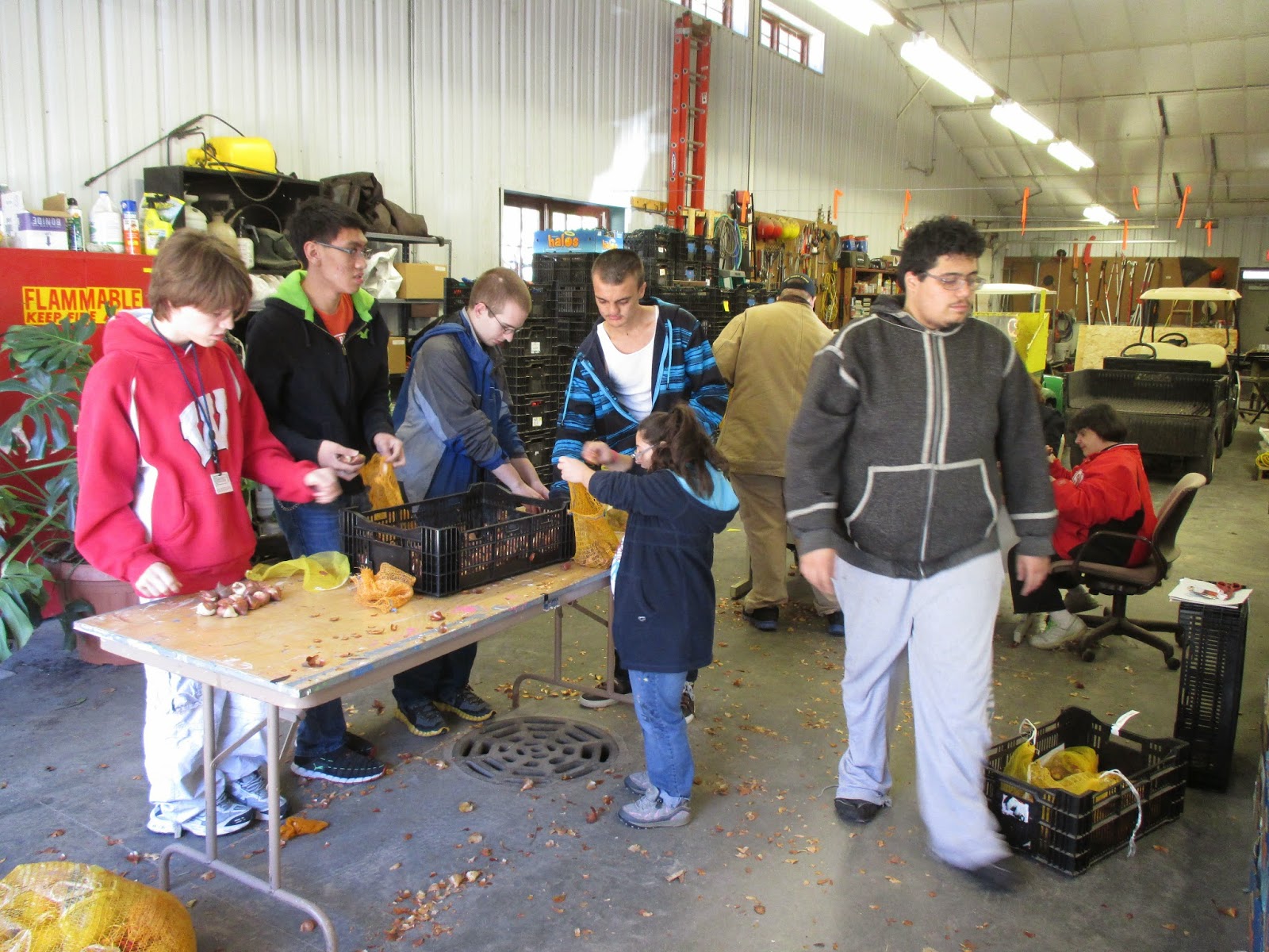 Our volunteers continue to help daily with a wide range of tasks. It's important to note that this Horticulture Blog focuses primarily on grounds volunteers but every day we have volunteers assisting in the Cottage Garden Gallery, with educational offerings, tours, etc. The many thousands of hours that are donated every year by hundreds of volunteers are vital and much appreciated. Above is Pat C. yesterday in the fern & moss garden inventorying ferns and existing labels. We're getting an idea on what died over last winter and through the year so we can order replacements and fill this collection out again. Below are Kathy (with flags) and Eva (next photo down) who did a great job sprucing up our front flower bed with a focus on late season weeding and removals. Kay (third photo down) spent another day primping her garden space in the shade garden which seems to have a new set of leaves on it daily. She did a nice job tidying up her space with many cartloads of debris returning to our compost pile. Tom (see bottom photos) was in to help with processing HLS lights as well as lots of work with preparing our tropicals for winterization. Janice was in to work with the Chestnut House volunteers (fourth photo down) and they did a great job processing 3,000 tulips (Tulipa) that will be planted in the entrance garden in a week or so.... Gena, Myrt and Nancy came in for significant leaf clean-up this afternoon and Urban arrived for debris collection and more pruning. Maury ran errands and we also saw Dr. Yahr, John J. and many others today. Further below are additional images from this morning.