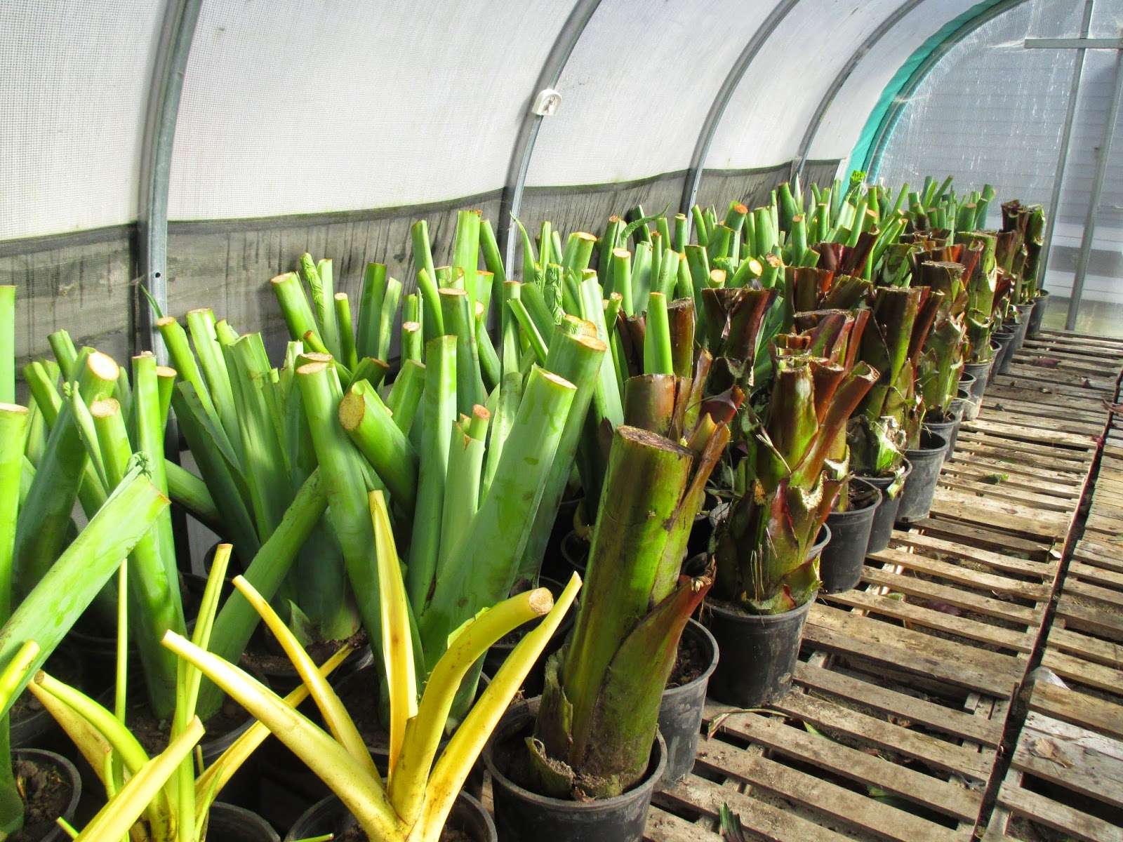 Our bananas (Ensete) and other tropicals really clogged up our greenhouse where we intend to store them so Tom (below) worked his "kung fu" and the end result at the bottom was more organized and easier to water for sure!