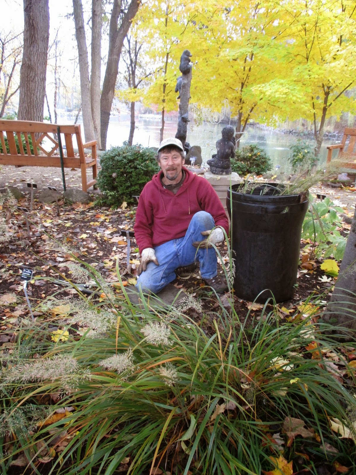 Our volunteers did another wonderful job today. Above is Kay who spent the morning continuing to tidy up the shade garden and areas adjacent to the sunken garden. She is thorough and came back with many cart loads of debris. Directly below is Ron K. finishing up much of his fall clean-up in the woodland walk garden which he kept looking great all year. Kathy and Eva finished clearing annuals in the entrance garden and also added significantly to our compost pile with repeated loads of debris. Dr. Gredler was in for his mowing rounds and we had the boys (John, Vic and Matt) from LP Tree Service at the gardens (second and third photos down) to hang our "dangling icicle lights" with their two bucket trucks. We appreciate the donation of time and support of the event by LP Tree Service every year. We also saw Maury and a couple others today. The fourth photo down shows the start of some work in the center of the Nancy Yahr Memorial Children's Garden which will ultimately be an awesome new feature (more to follow). Note the 15" of topsoil on pure sand which is no surprise as the original site of the gardens was a sand & gravel pit mined by the Wilcox Sand & Gravel Co. 100 years ago.