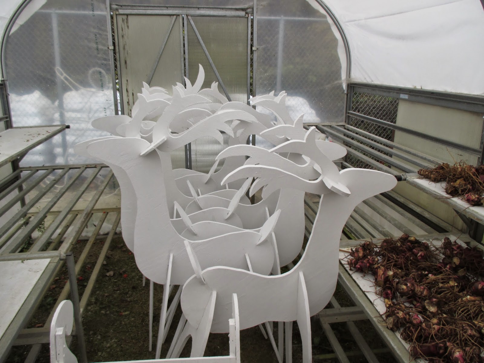 The grounds staff split duties between gardening and HLS set-up. Above is Pat balancing the lower portion of our second "Tower of Power" which he'll get up next week. Pat worked on finishing up the first tower in the reception garden and will focus on this one next week. Cindy continued garden clean-up outside the reception garden and in other locations. She also did the cutting display and helped mark the dangling icicle lights with bright tape so they can be seen by people, mowers and deer alike! Big John and Terry emptied out more containers this morning and moved on to some significant progress with getting more HLS displays out in the gardens and secured. Placement of displays changes each year but essential considerations are view angles, power source and proper securing against the elements. The guys also helped the LP fellas later in the afternoon. I was able to run a good 2,000 feet of cords this morning and then caught up on desk work in the afternoon. Below are more photos from this morning.
