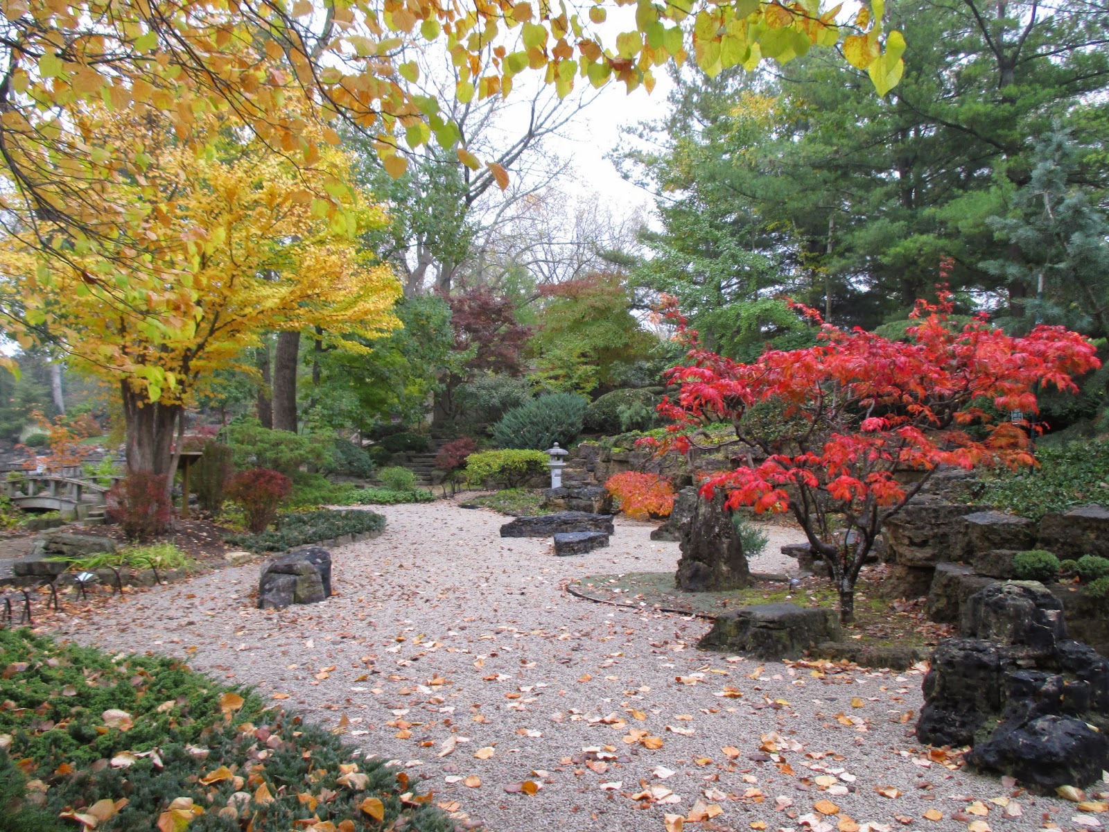While I've observed that the timing of fall color this year has been a bit "off", the vividness is still quite nice as seen with the Tiger Eyes sumac (Rhus typhina 'Bailtiger') above. It seems that some trees/shrubs should have better fall color or fall color hasn't started on some specimens that we would expect. Regardless, throughout the gardens, fall color continues to peak here and there and the Japanese garden on this overcast day was spectacular (see below). There was some drizzle overnight but the rain held off today until about 2 pm when it became a consistent drizzle. However, we did have a very productive day out in the gardens and the rain is certainly welcome and looks likely throughout tomorrow as well. Further below are some maples showing respectable fall color too!