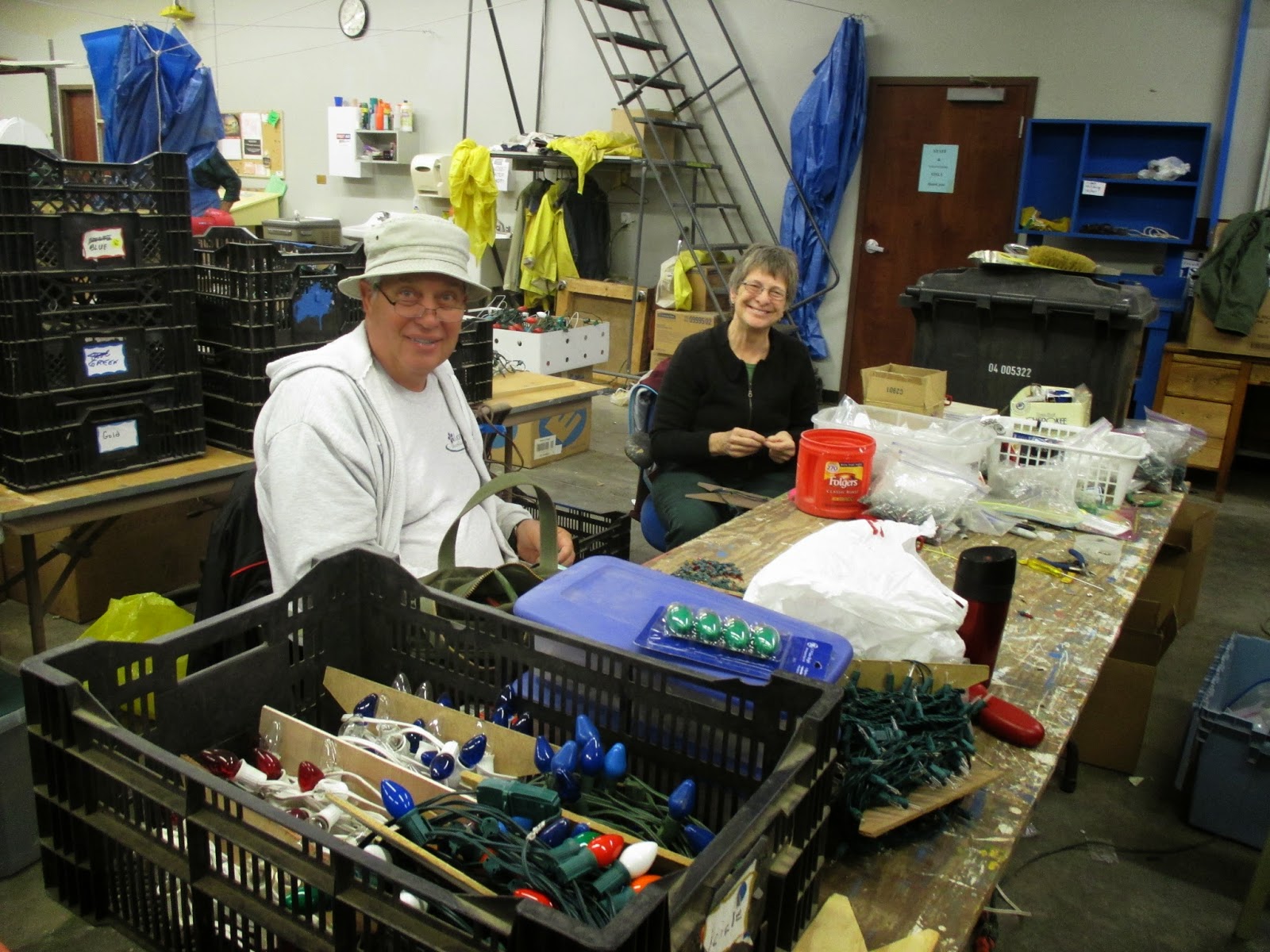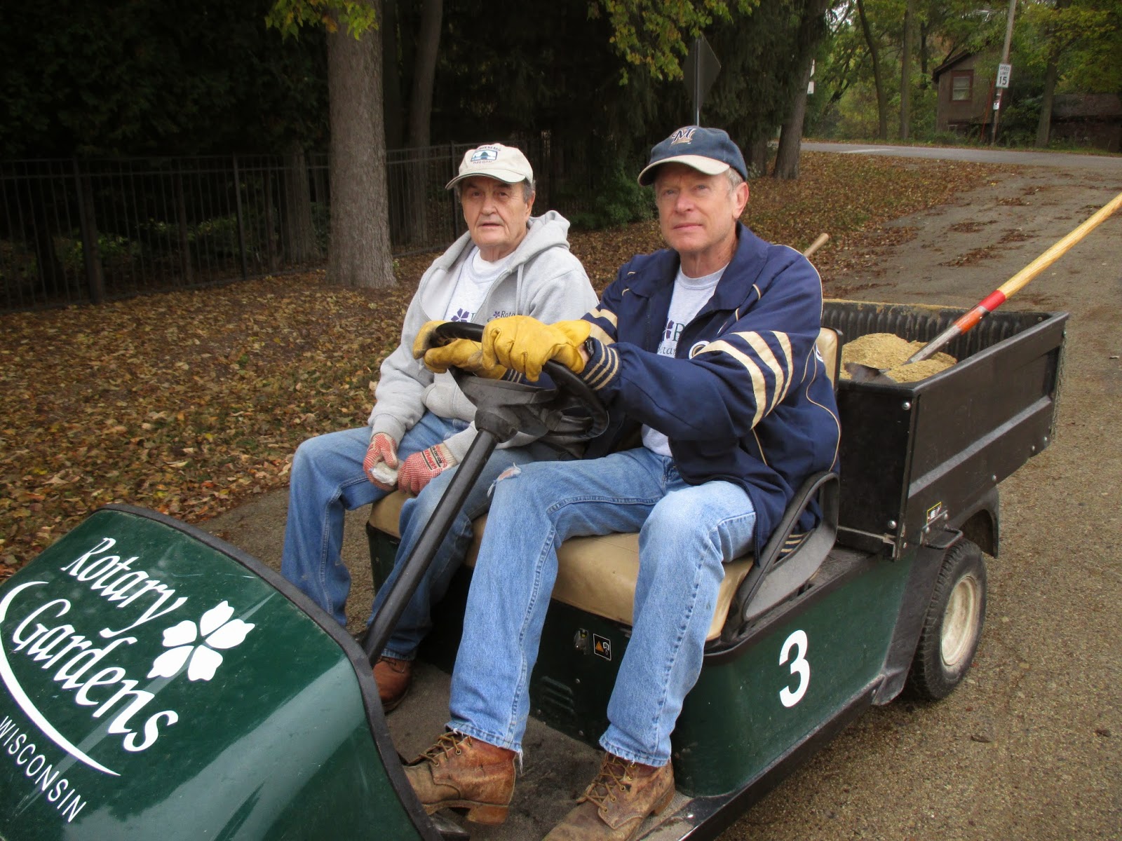 We had a nice distribution of volunteers both inside and outside today. Above are Jim (foreground) and Dave working on a project for the Holiday Lights Show (HLS). The second photo down shows Ron and Patrea (Pat M. just off camera) troubleshooting lights for the HLS. This trio has been very productive with testing and repairs this year. The second photo down shows Ken putting a fresh coat of paint on our PVC candy canes for the HLS. It's nice to have this progress and we'll likely be working on indoor HLS components tomorrow if it's rainy again. Dick H. came in to make some dump runs and continues to work on repairs for one of our vehicles. Maury came in to pick up 70 pumpkins (with Gary S. and Rollie) for the youth education program and ran some errands for us as well. Gary S. created more labels and Dr. Gredler was in for a full day of mowing out in the gardens. The third photo down shows Alan M. in the foreground raking leaves with Bob C. and Larry H. in the background repairing potholes. The fourth photo down shows Larry H. (driving) and Bob C. en route for path repairs. These guys did some great work as did Eva and Kathy (fifth photo down, Kathy to the right) in the reception garden with Shirley H. These ladies began clearing annuals with a focus on clearing space for HLS "decorating access." Del came in later for painting and we also saw Marv B., his son Dan B., Dr. Yahr, El B. and many others.
