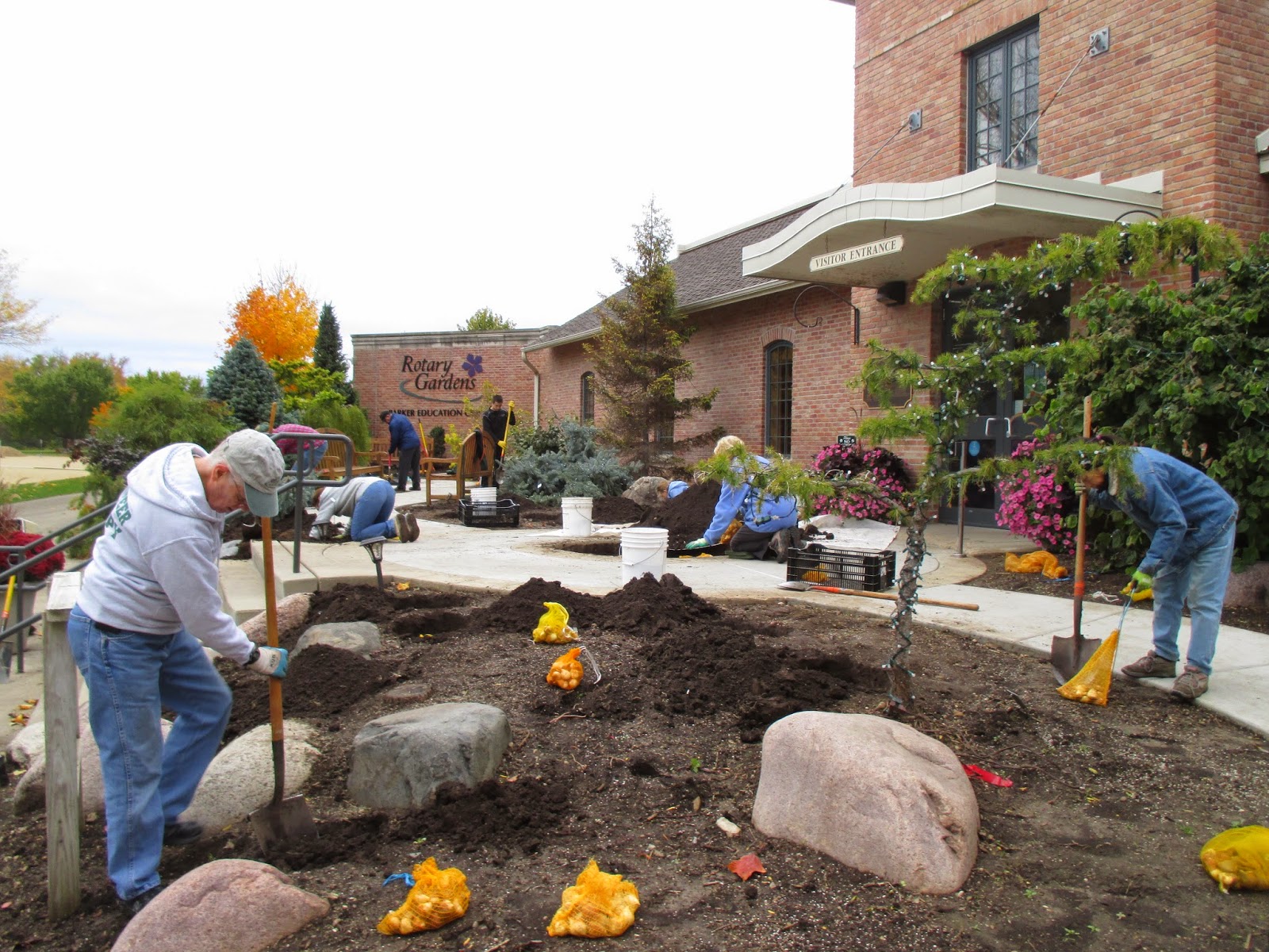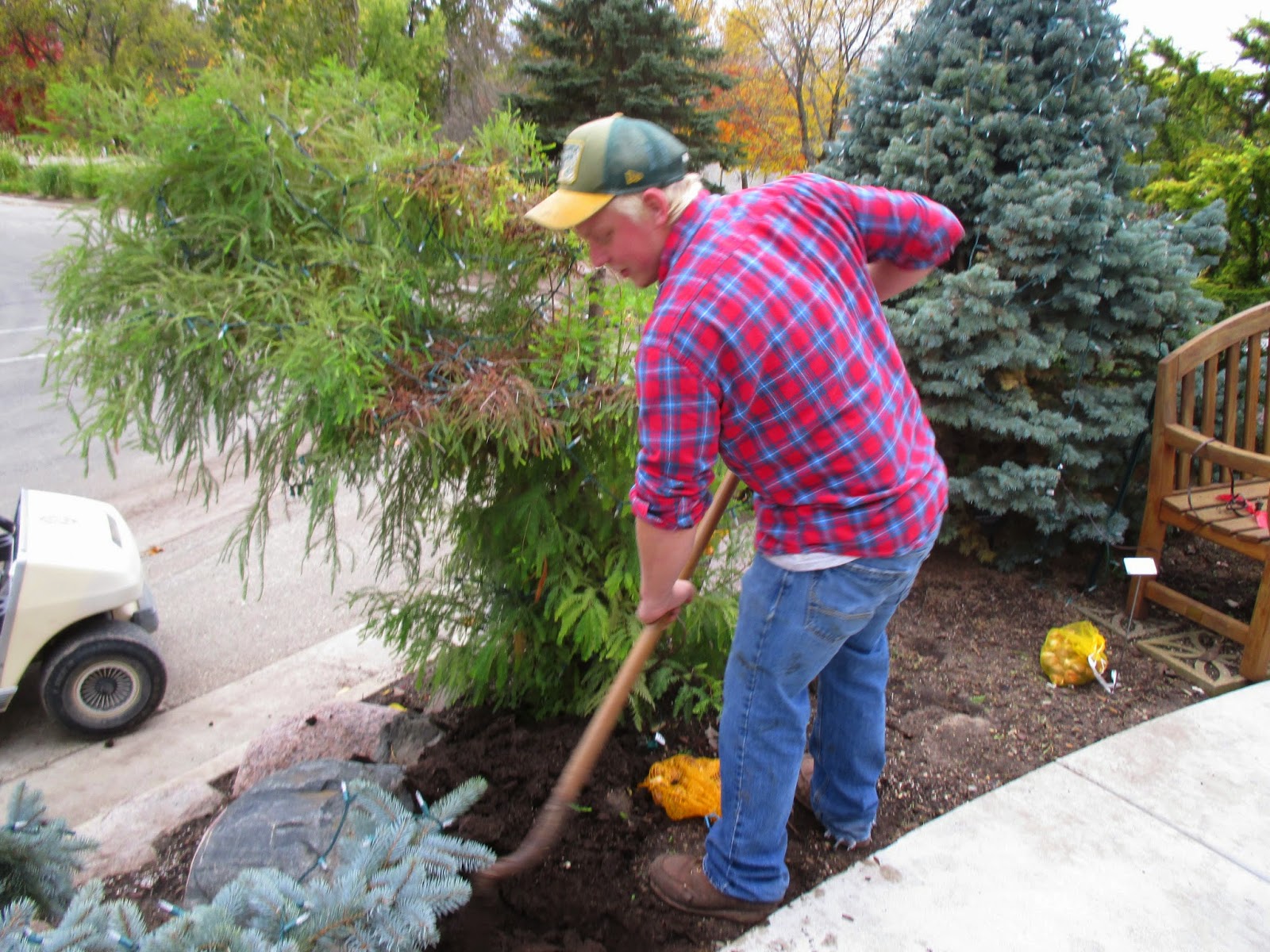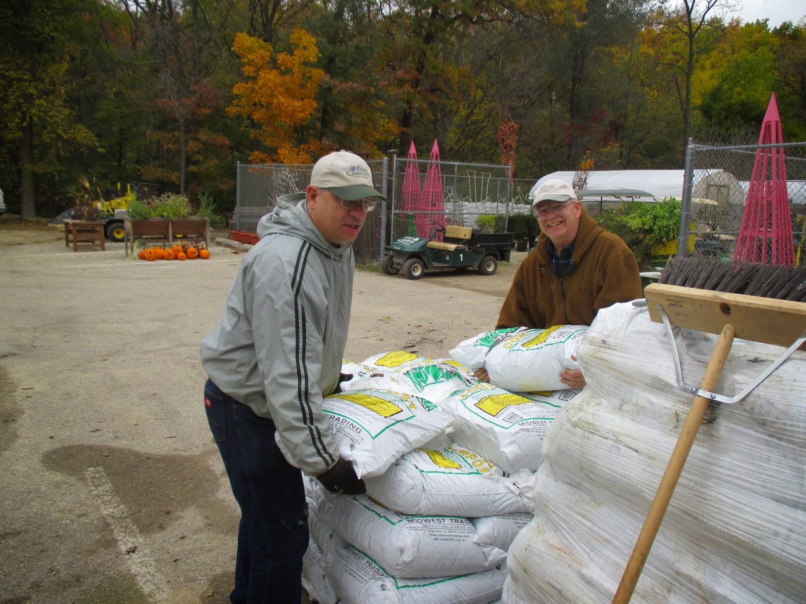Our last volunteer work day of the season was very successful today. With Lily above leading the charge, we were able to plant 3,000 tulips (Tulipa) in the front entrance garden. We had a lot of great help which included Lily, Sue, Bob D., Bev D., Tom F., Brian, Jason, Big John, Gary S., Fran, Dr. Steve B., Talen, Bill O. and Larry O. We were not only able to plant all those bulbs but removed most of the remaining annuals from the entrance garden (led by Big John and Tom (seen directly below)). Our Compost Clearance Sale went well as we sold another 200 bags or so. Thanks to Joy for running the register and both Russ and Stan (eighth photo down) helping as loaders. We also saw Maury, Dr. Yahr and many others today. It was a great day and Lily made us all feel younger (or maybe older..). See her at the bottom next to 'Princess' elephant grass (Pennisetum purpureum).