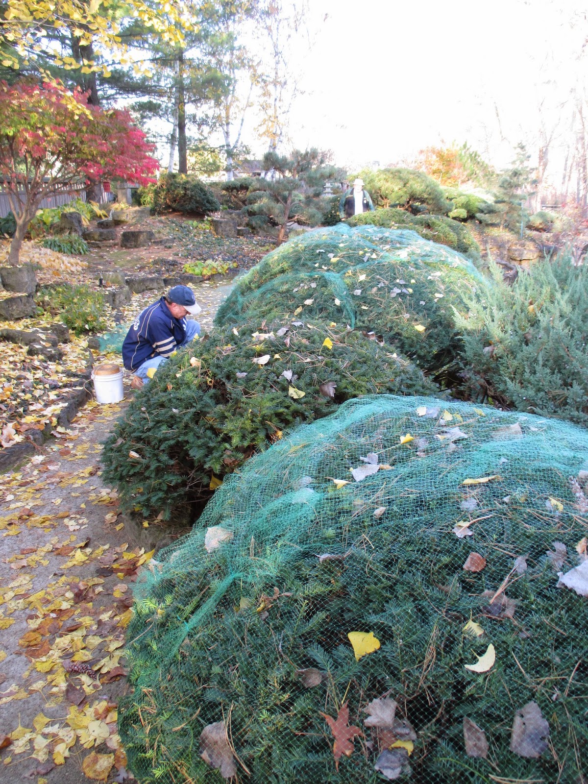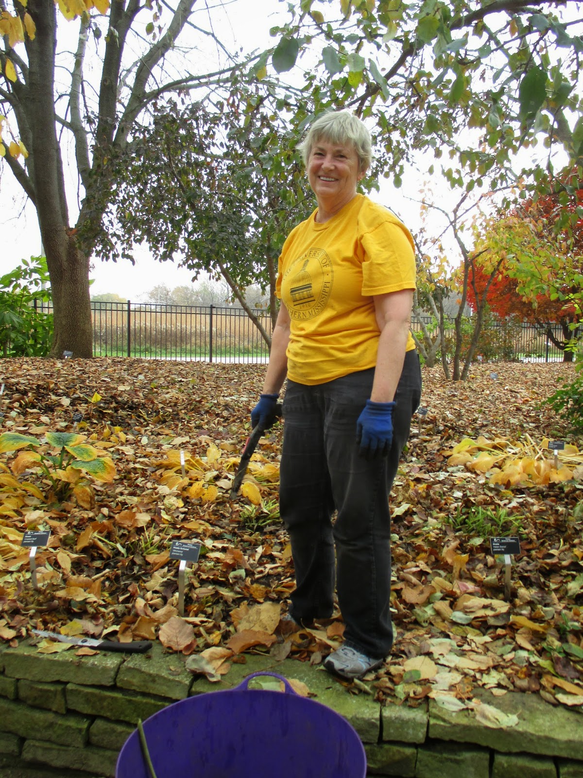 It was a great day for volunteers. Bob C. and Ron R. worked on putting lights on our arches while Pat M. continued his progress on "Tower of Power" #2 which is looking good. He does a very nice job and is as detail-oriented as they come. The carpenters (Dave, Jim and Ron Y.) continued progress on the "elf workshop" which will be a new addition (one of two) for the HLS. Ken continued painting the large PVC candy canes and Ron P. continued his lights repairs. Lloyd (above) collected leaves along with Gary S. (directly below) and Alan M. Kathy (second photo down) worked with Terri (third photo down) and Eva (fourth photo down) on cutting back perennials and collecting garden debris in many areas. Dr. Gredler had a full day of mowing and Maury was out running errands this morning. The fifth photo down shows Dick P. and Dick H. bringing in the 'Russo Family Fountain' for winter storage. The guys also collected the 'Dancing Waters' fountain and have done this for many years. The sixth photo down shows Larry H. (foreground) and Gary B. putting protective netting on the yews (Taxus) in the Japanese garden. This should thwart the deer nibbling this winter although rabbits may continue to be a problem. Jumbo Jim came in with three RECAPPERS this afternoon and continued protecting plants in the Japanese garden for winter and accomplished quite a bit of clean-up as well. We also saw Arnie, Hal R., Mark S., Rollie and many others today.