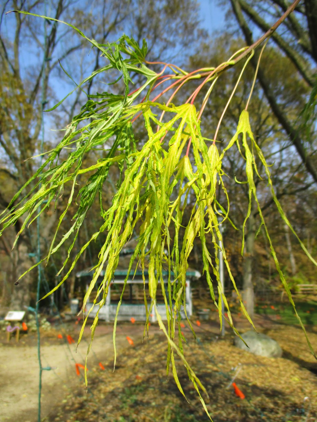 The grounds staff accomplished a wide range of tasks today. Above is the fall color on a variegated maple (Acer pictum ssp. mono 'Hoshiyadori') which still shows the mottling on the leaf! Cindy worked entirely on HLS today by marking more of the icicle lights (so we don't get tangled in them) with marking tape. She then hauled out many of our 1/2 gallon milk jug luminaries for placement around the HLS route. We get them spaced first and then will wire them up later in the coming weeks. We'll still need access to areas for gardening and mowing so try to do the best we can to balance all of these approaches. Big John and Terry put up many more displays including the start of the sleigh/reindeer in the sunken garden. The guys also emptied some containers and put up additional lights. Larry did a wide range of tasks related to gardening and the HLS. He was a huge help securing some of the new lights so they wont get too tangled up when the winds arrive. I ran cords for a half day and caught up with desk work for the other half. This is a typical day for me this time of year but I'll have to focus increasingly on running extension cords so we're ready to roll. Below are more photos from this morning.