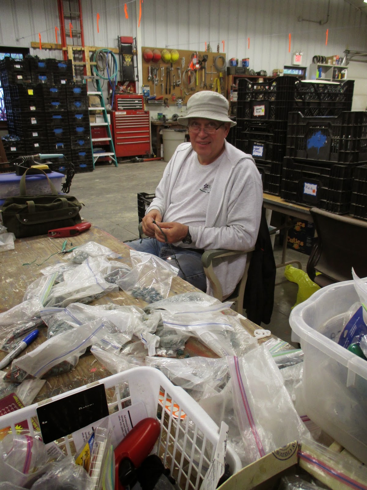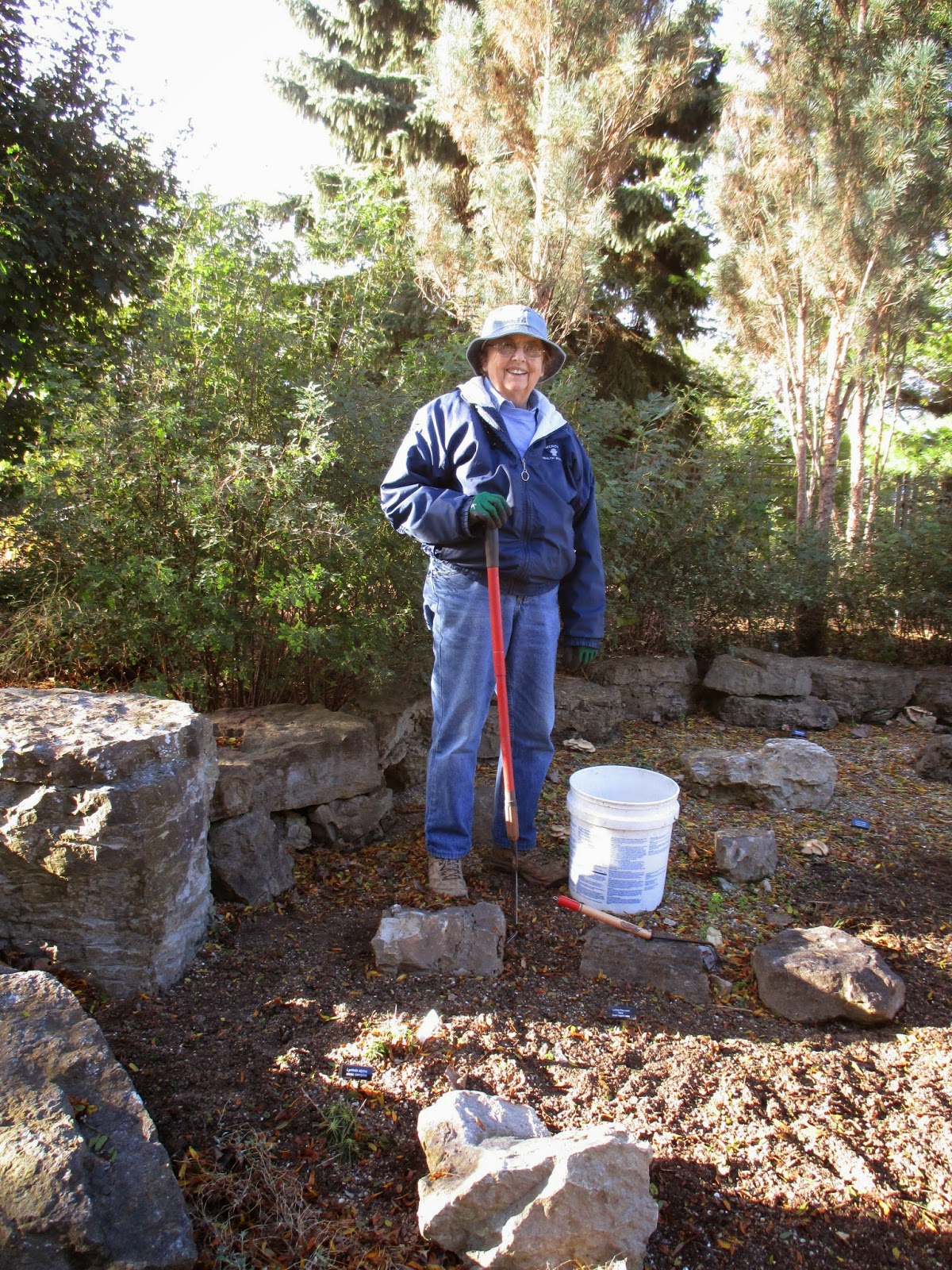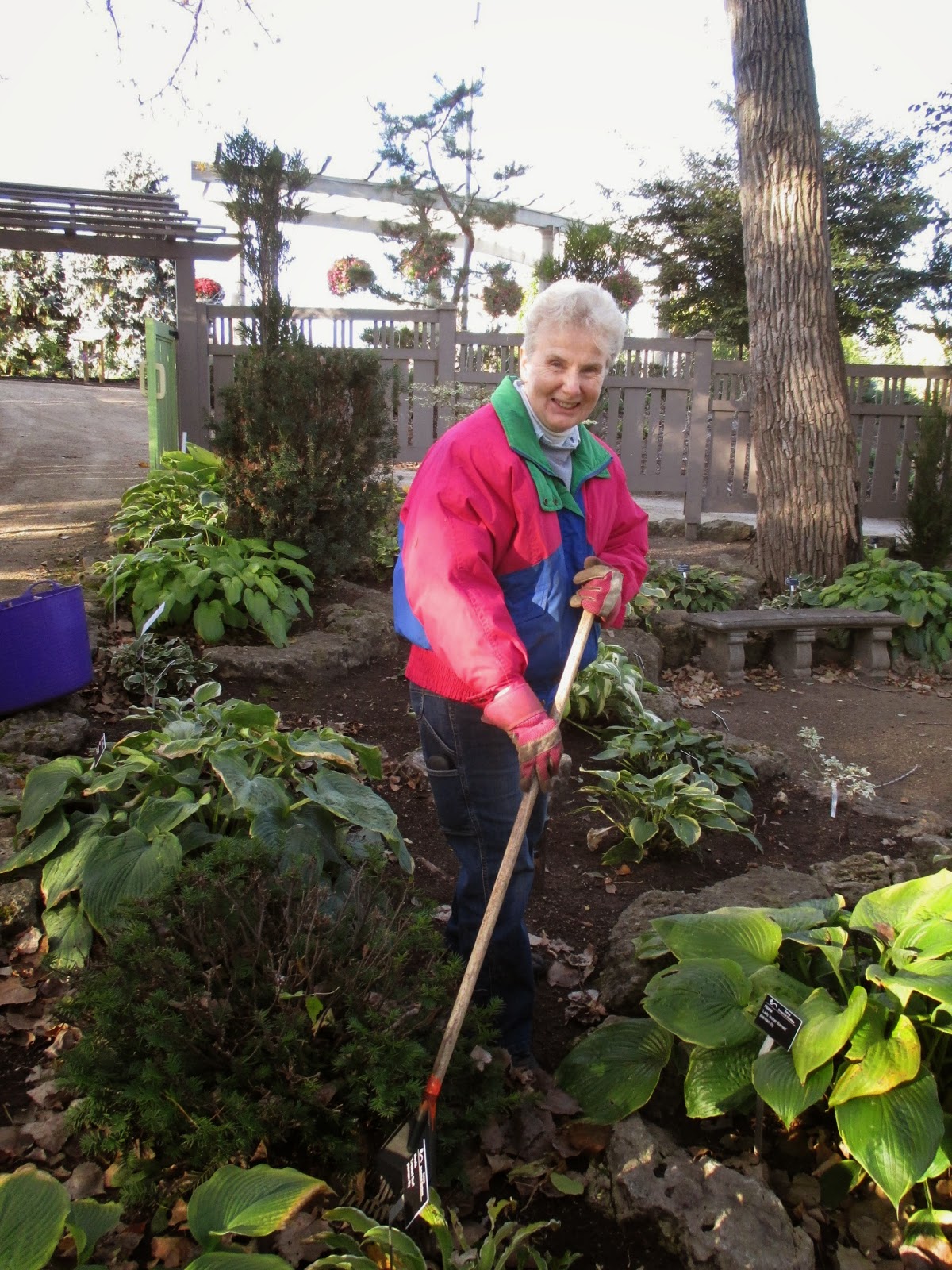 Our volunteers were engaged in a wide range of tasks today. Ron P. above continues to be one of our primary "lights repairmen" (along with Pat M., Joe and Patrea). Below are Jim (left) and Dave working on a top secret new addition to the HLS. Our carpenters are extremely handy and these gentlemen were joined by Bob K. later in the morning. Bob also helped bring back a cart with Larry that had some mechanical issues. The second photo down shows Gary B. (left) and Larry H. bringing back one of dozens of loads of leaf debris. The guys focused on the North path and other areas. Our WWW (Women Weed Warriors) focused on leaf collection today. We had Mary R. (third photo down), Peg (fourth photo down), Bonnie, Suzie, Sue C., Linda S. and Vicki in the afternoon. Shirley H. (fifth photo down) focused her efforts in the Scottish garden and did a superior job as usual. Both Shirley C. and Betty came in to tend their respective garden areas and Nancy N. was in for an office project most of the day. Bill O. came in for mowing duties and Randy M. spent most of the day repairing many of our HLS displays. Urban popped by at the end of the day for some pruning too.