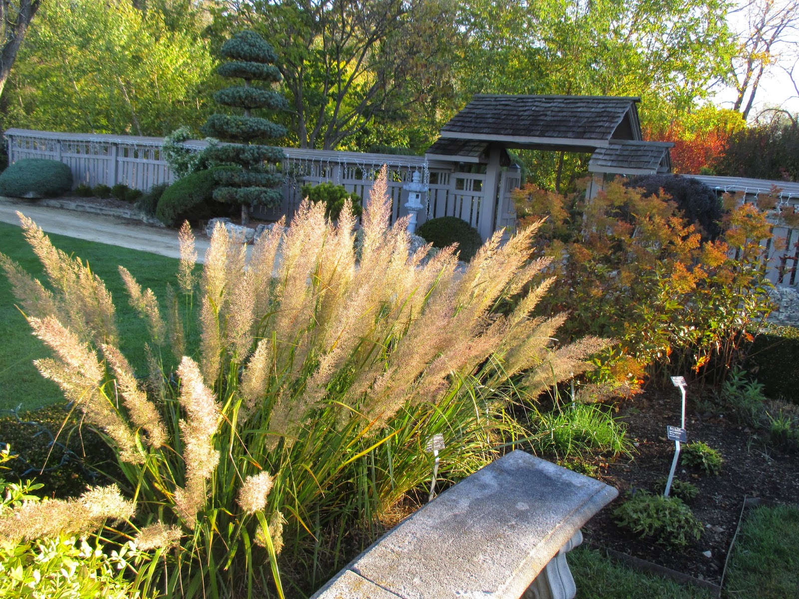 It was another gorgeous day although a bit chilly early this morning. The sun came out and we enjoyed a great day out in the gardens. The photo above is from the Japanese garden with a pruned Amur maple (Acer ginnala) offering the fall color. Progress continues daily in regards to the Holiday Lights Show (HLS) preparations and set-up although plenty of gardening tasks were accomplished as well. It was a solid day of work both inside and outside with an industrious and ambitious crew of volunteers helping with many tasks. Further below are some additional images from the gardens taken yesterday and today.