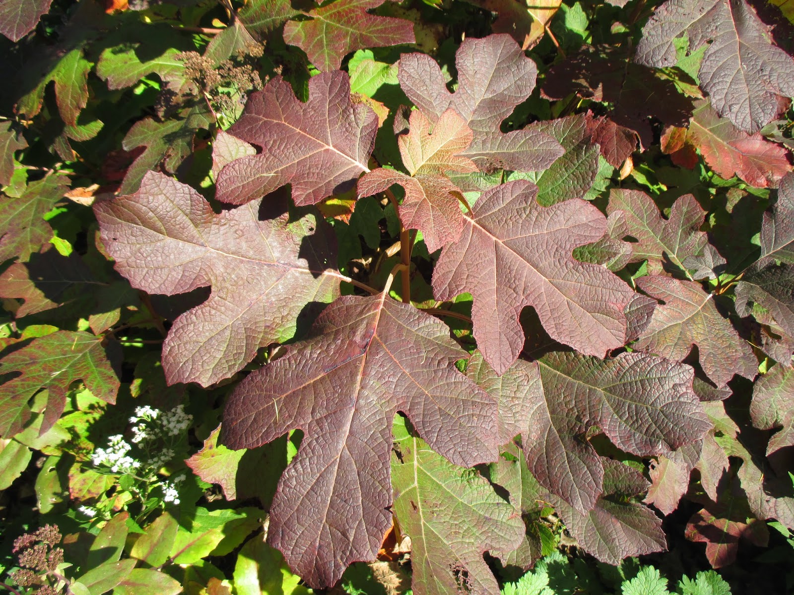 start of fall color on oakleaf hydrangea (Hydrangea quercifolia) - woody shrub