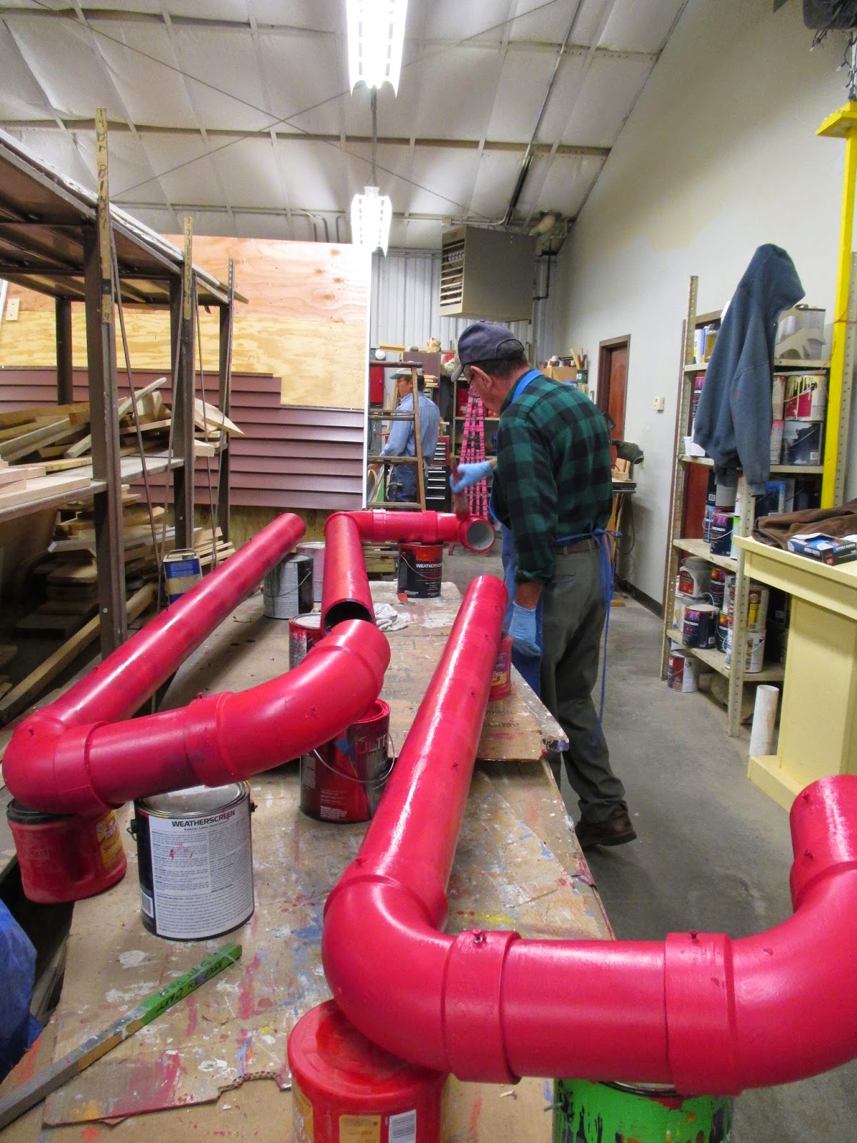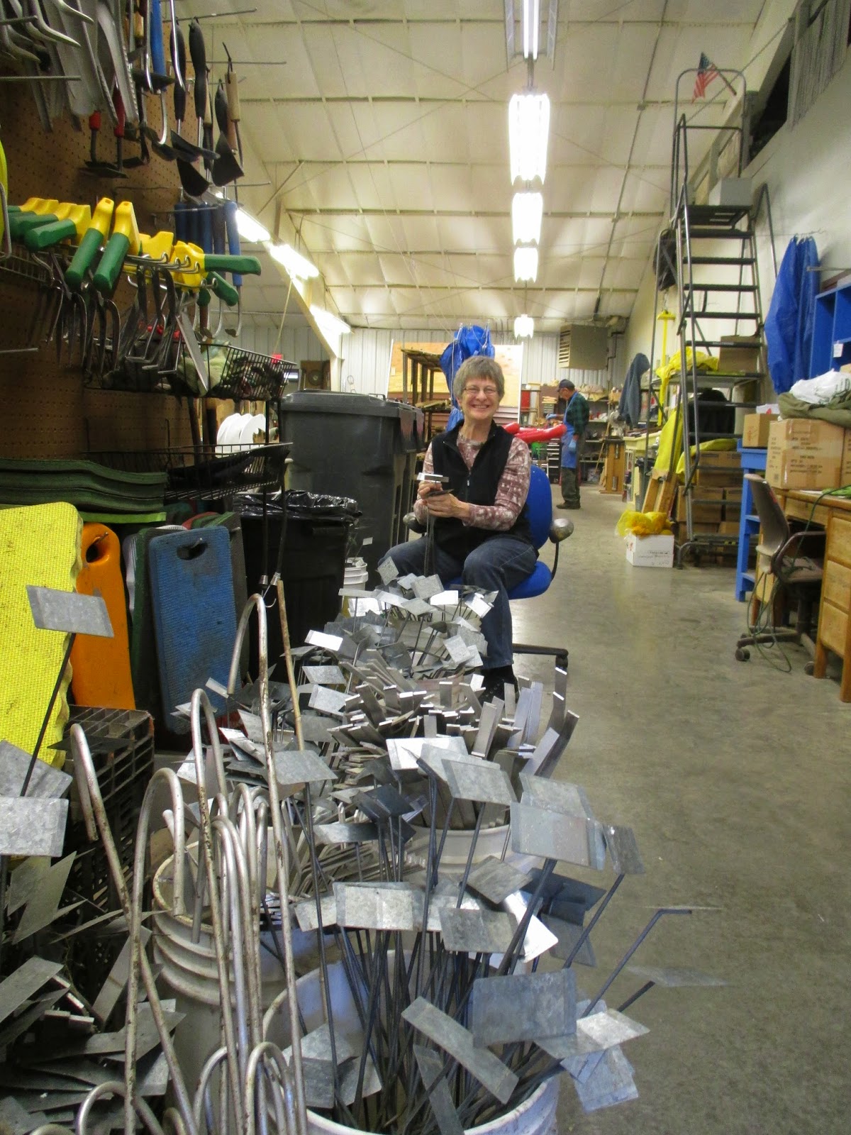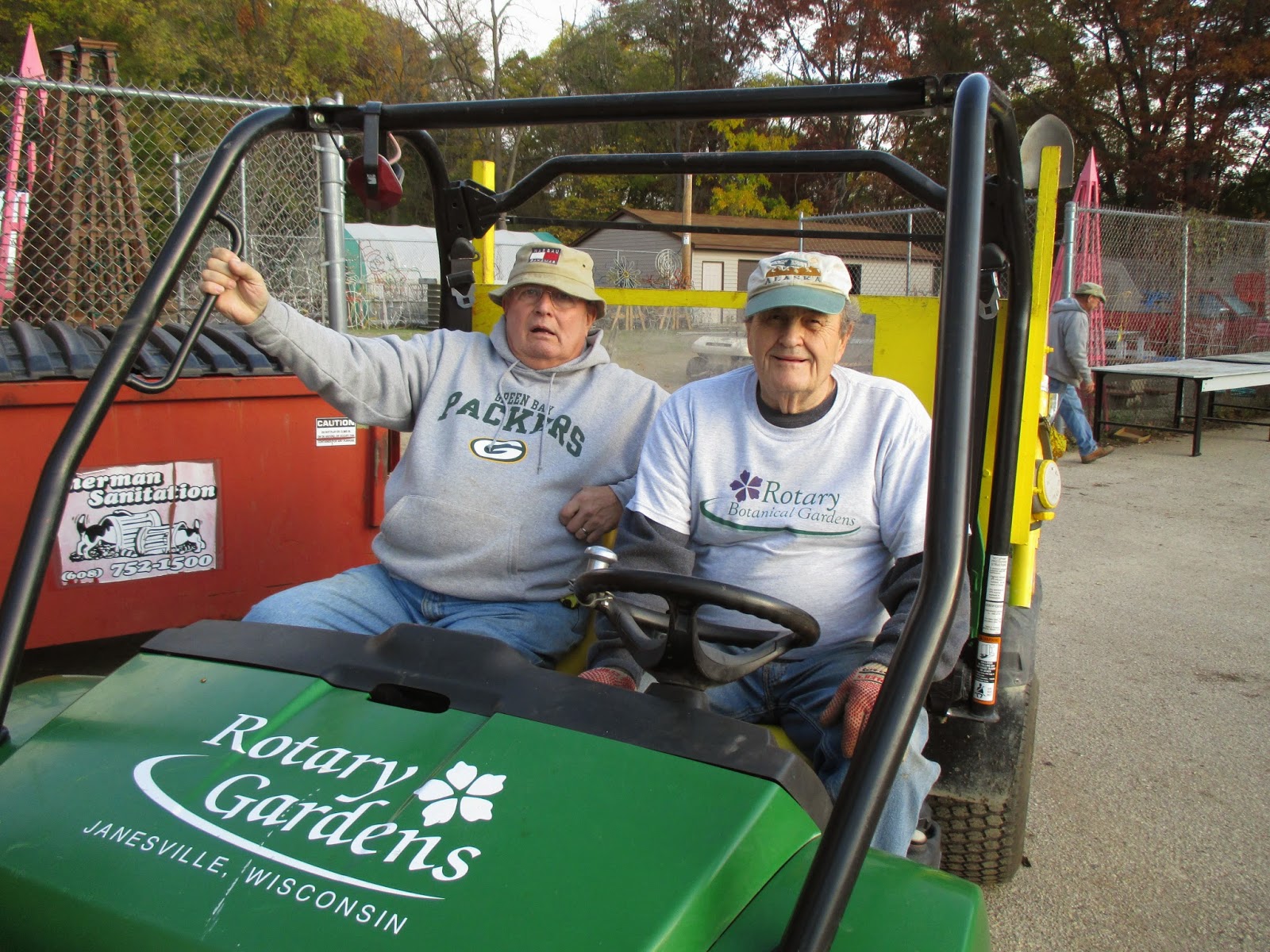 Volunteers helped both inside and outside today. Above is Patrea working on processing the hundreds of labels that come back daily when we remove annuals. We peel off the current sticker labels and organize these by height for winter storage and re-use next spring. She did a great job. Below is Ken continuing his quest involving repainting our larger PVC candy canes before we secure new lights on these for the HLS. The second photo down shows Bob K. (left) and Jim working on a special project for the HLS. The third photo down shows Gary (left) and Bob C. heading out. The guys filled buckets with sand (for our HLS paths when icy) and headed out for removing annuals and collecting leaves. Alan M. did a nice job collecting many leaves from multiple locations. Lloyd, Shirley (fourth photo down) and Eva worked on removing annuals in the formal gardens and later split up to additional locations for the same task. Dr. Gredler was in for mowing duties and "fireman Bill" stopped by to say hi. Maury and Gary S. ran for pumpkins for the youth education program and both guys moved on to other duties as well. We also saw Shirley C. (fifth photo down) who came in to remove annuals from her assigned garden area. She has one "bum wing" but worked one handed and accomplished a lot! Now that's dedication. We also saw Dr. Yahr, Marv B., Kris K., Chuck S. and many others today.