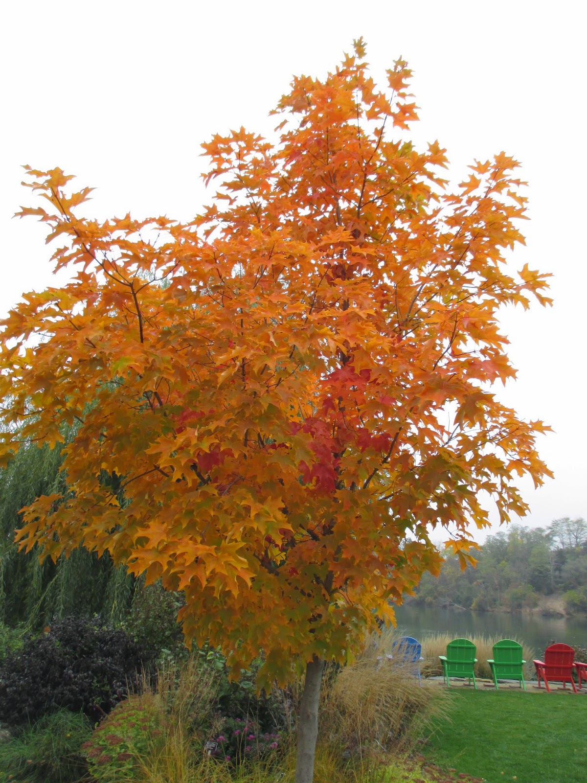 Above is the beautiful Fall Fiesta sugar maple (Acer saccharum 'Bailsta') which looks better each day near the North point garden. Volunteers today included Kay and Eva helping purge annuals from our front garden with Cheryl. We'll be planting tulips (Tulipa) in front of the Parker Education Center on Saturday so need everything cleared out in advance. Bill O. came in for mowing duties and Nancy N. continued working on her bench lettering project. We had our Garden Development & Maintenance Committee Meeting which included Larry H., Big John, Maury, Christy, Christine, Hal R. and Gary S. Maury also ran some errands for us. We also saw Dr. Gredler, Dr. Yahr and Urban today.