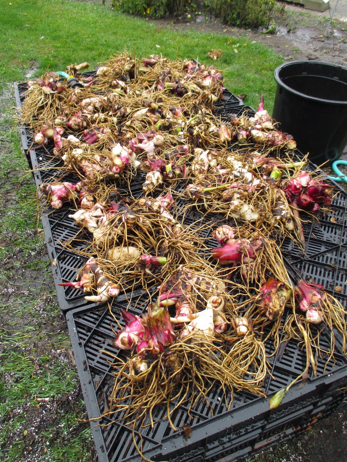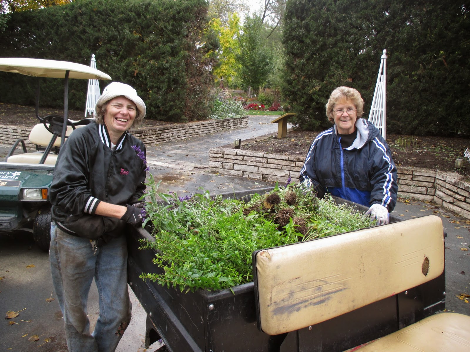 Despite a skeleton crew of just Janice and I today, we were able to keep a lot of volunteers busy. Above are Eva (left) and Kathy in the reception garden where they continued to remove annuals from this garden. Below are Sue (left) and Peg, who along with Bonnie (off camera), created some huge piles of debris in the sunken garden. Our Grumpy raking crews included Gary B., Alan M., Ron R. and Bob C. The guys collected lots of leaves off of the paths and helped haul accumulated debris from the reception and sunken gardens. Del had some indoor work with painting as did Ken. Betty H. removed more plants from her garden space and Bill O. was in for quite a bit of mowing. Jim worked on carpentry projects while Pat M. and Ron P. finished up some Holiday Lights Show (HLS) testing tasks. Pat also had some duties out in the gardens. Terry came in to move the compost around with the end loader and loaded up debris for Dick H. to haul off to the dump. Dick was also working on one of the trucks today. Rollie and Maury made a run for memorial bricks. We also saw Big John, Larry, Charlotte and many others today. Further below are more images from this morning.