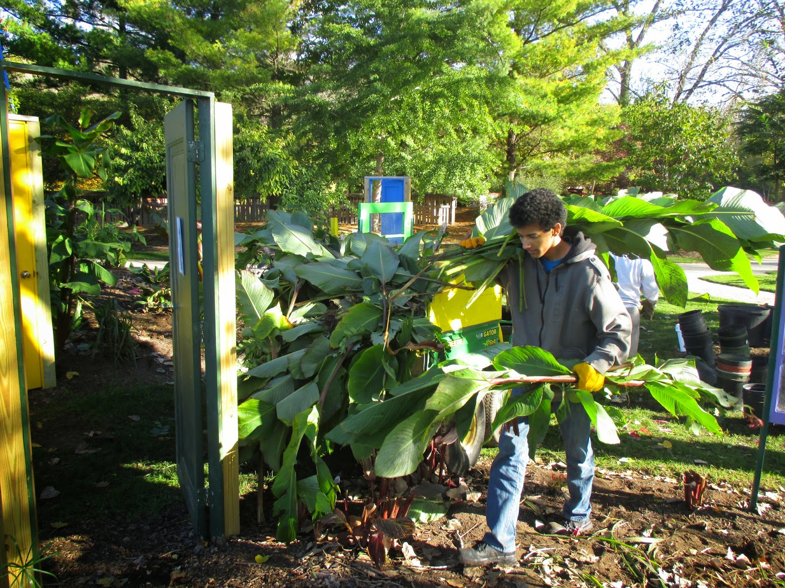 We had some excellent help today from 18 high school students and their teacher (Kath B.) from Oakhill Christian School here in Janesville. This crew has historically come and volunteered every April and October for the past six years. While the faces change over time, we've consistently been impressed with how hard working these volunteers are upon arrival. Above is the crew posing near the gazebo and below are some action shots as this group tackled duties in the Jungle Garden which included removals, potting up tropicals (bananas, elephant ears, etc.) for winter storage and processing other plants for saving over the winter as well. The group did a great job and we had help keeping up with them from Janice, Tom, Alan M., John and Terry. We hauled plenty of debris back to the compost pile and the group finished clearing over 75% of the Jungle Garden which involves many different beds. Check out some of the action below...