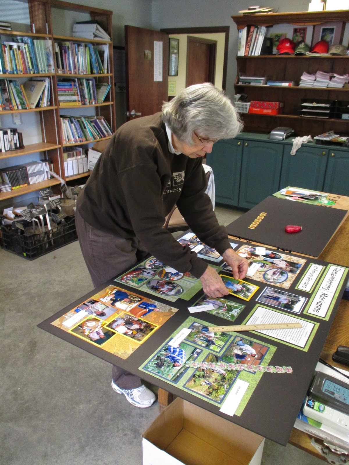 Aside from our wonderful volunteers from Oakhill Christian School, we had some additional help from many veteran volunteers. Above is Dick H. repairing one of our green carts which had some serious problems yesterday. Dick is one handy guy and as a retired auto shop teacher, has a wealth of knowledge that has benefitted the gardens! Alan M. came in for leaf clean-up and helped with our Jungle Garden "purge". Dr. Gredler came in for his mowing rounds prior to another busy weekend (two weddings). Randy M. (below) continued on another day of repairing some of our HLS displays which he originally built many years ago. The second photo shows him sitting down on the job. Eva and Kathy (third photo down) did a nice job purging and tidying in the terrace garden, along the red wall planting and in the reception garden. Ron K. came in to work in his area and collected leaves as well as debris from cutting back some select perennials. He came back with many loads. Tom F. was a big help with our morning jobs and is our "go to guy" for processing tropicals. The fourth photo down shows Kay who did another dynamite job in her section of the shade garden and in the gazebo garden. We also saw Dave M., Al H., Dr. Yahr and many others today. The bottom photo shows Nancy N. yesterday doing an amazing job of putting together a "memory board" for Marianne Bue's memorial services tomorrow. I just printed the photos and she did the rest with some help from Janice.