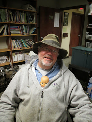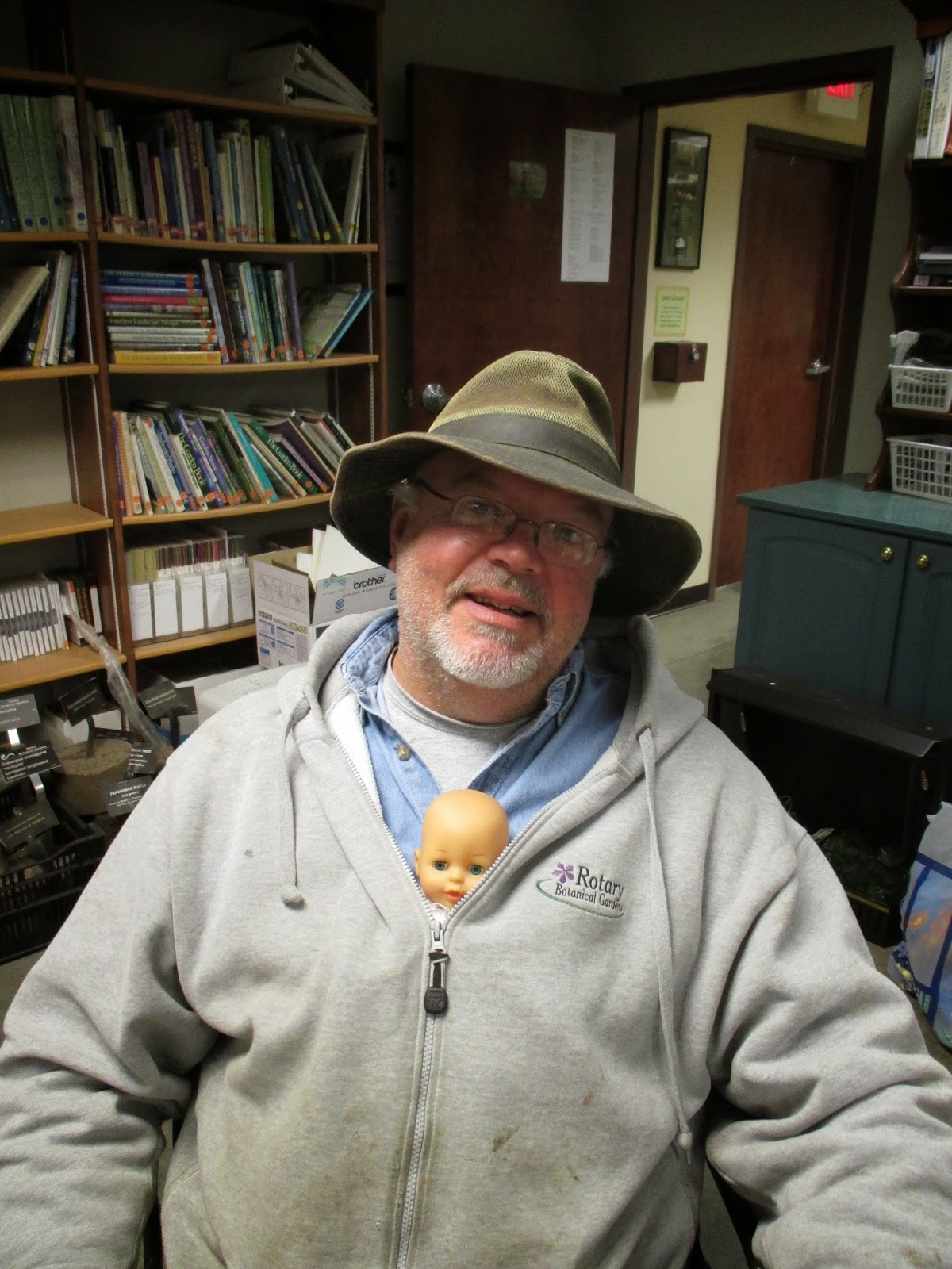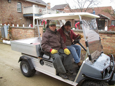Big John (above) started the day by being a bit creepy but that's not unusual. John put up more displays and LOTS of lights today. He does a nice job and has a knack for decorating. Cindy processed the last of our cannas for winter storage, put up oodles of lights in the Japanese garden and fern & moss garden and helped process signs and some other HLS supplies. Larry (seen below driving) worked most of the day with Bill (his smiling passenger) and helped with a large delivery, ran cords and bounced between various projects. I was cord boy again today and was inspired to buy new gloves later this evening after my threadbare gloves proved to be insufficient earlier today! Larry H. helped put more protective netting on some evergreens to thwart our winter nibblers and we had our Garden Development & Maintenance Committee meeting today (Larry H., Big John, Dr. Gredler, Maury,Hal R., Gary S., Christine, Iza and Dick P.). Pat M. was in to work on a couple projects including some more HLS work. We also saw Chuck S., Dr. Gredler, Kay F. and a couple others today. Maury also ran some errands for us. Further below are some additional images from today.