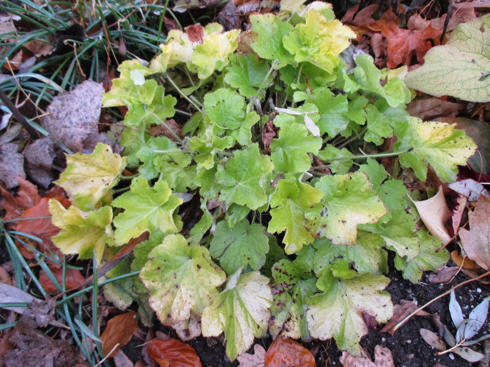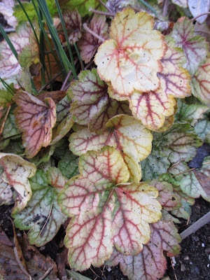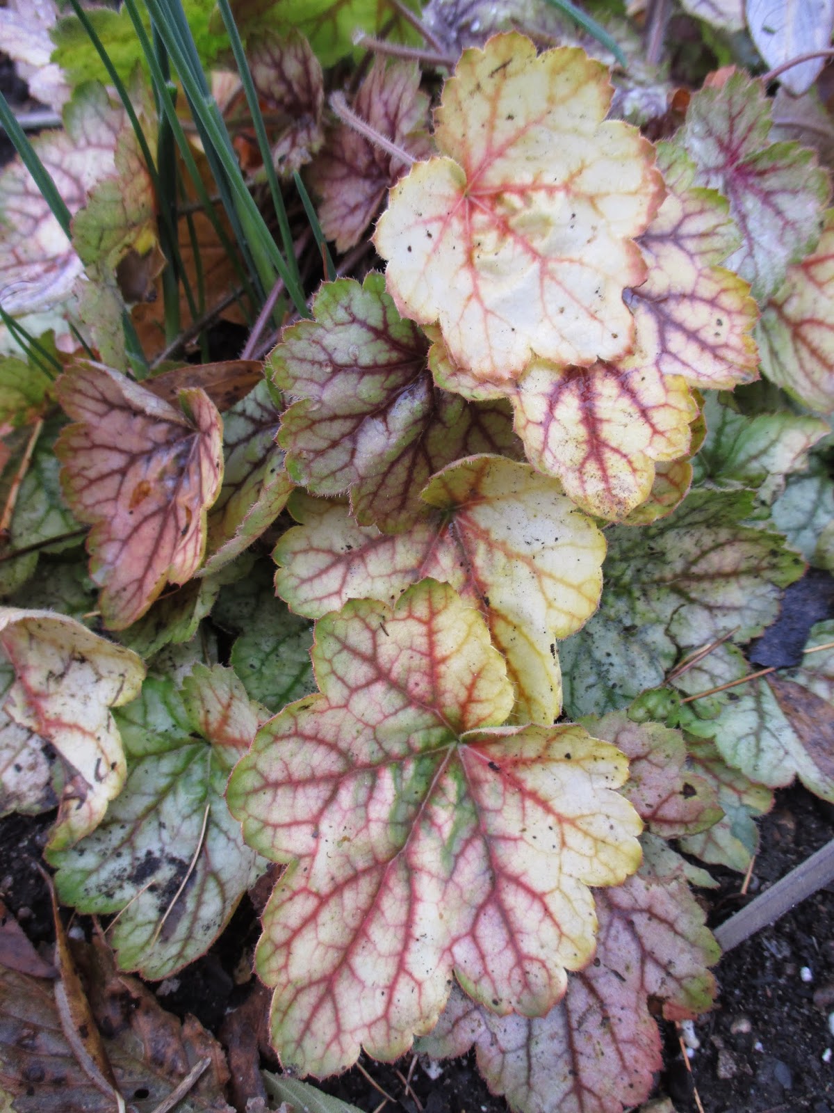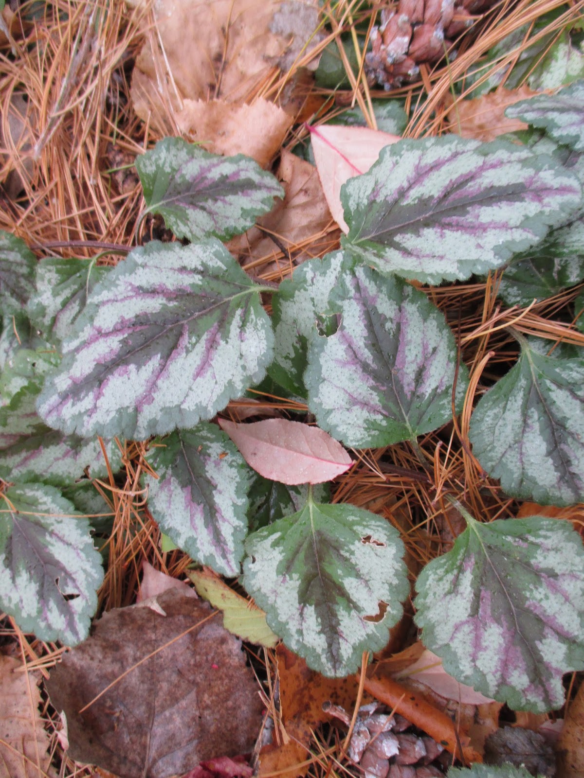 maroonish fall color tints on creeping archangel (Lamiastrum galeobdolon 'Variegatum') which is beautiful (perennial) but can be a thug (be warned!)