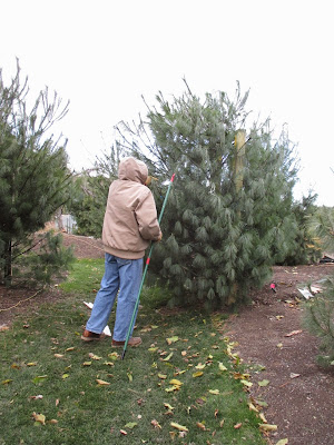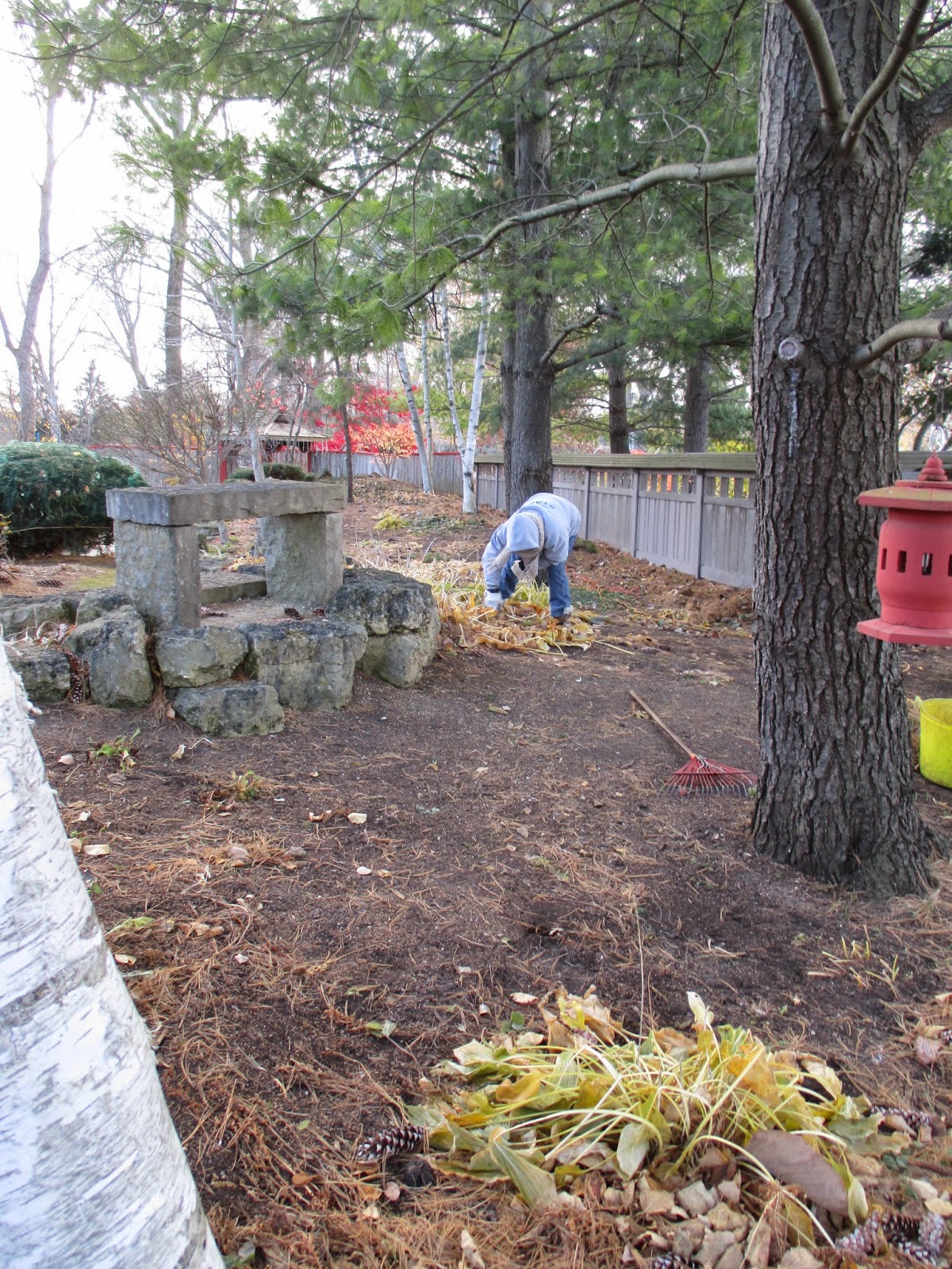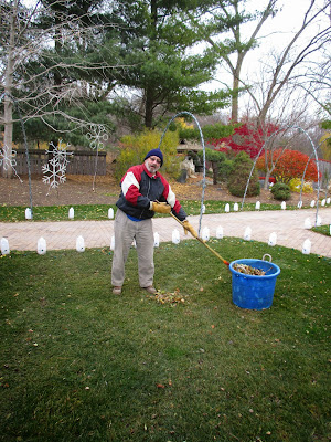 Alan M. (above) continued his raking focus in many areas today. Alan started this year as a Grumpy and has come in quite often since starting. He has been a huge help, particularly with this fall clean-up. Whitey (below) spent the entire day putting up more lights on our temporary white pines (Pinus strobus) and has done a great job over the past couple of days. Pat M. worked on some HLS projects and gardening projects in the reception garden. Ron P. was in for more lights repair and we saw Marsha M. and Dr. Yahr as well. The second photo down shows Cheryl doing some gardening in the Japanese garden. She had a full day in the garden and did a superb job in this "tough to access" area. Cindy worked on putting up lots of lights for the HLS today and helped process some cords this morning. The duo of Big John and Terry continued putting out some of our last displays for the HLS including a new, large LED display which looks pretty cool. I ran cords all day and probably have another five days of the same to finish up. Further below are more shots from today.