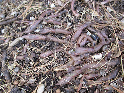 roots?..worms?...nope. These are the shallow, fleshy rhizomes of Canadian ginger (Asarum canadense ) which will send out foliage and flowers next spring - perennial (nice groundcover)