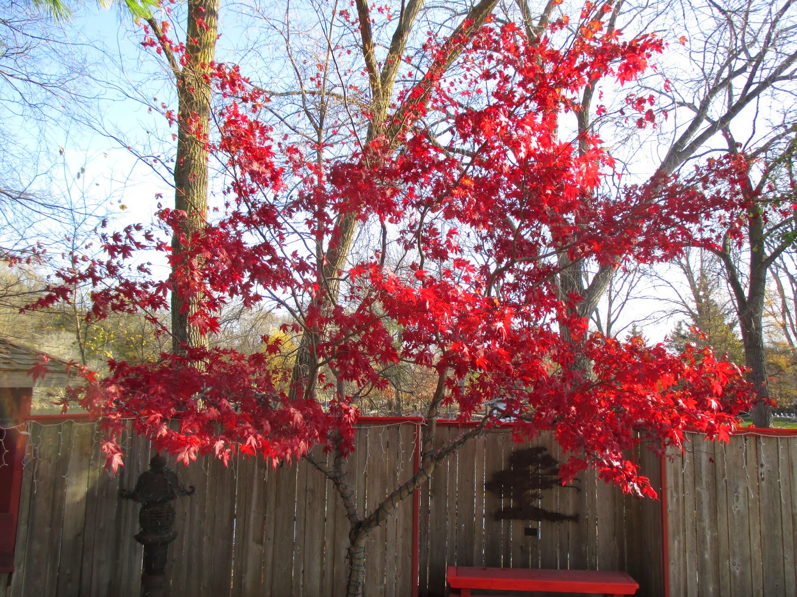 It was a frigid day but at least we had some sunshine. The light coming through the fall color of this fernleaf buckthorn (Rhamnus frangula 'Asplenifolia') above was nice though and provided at least a little warmth! We all headed outside right away for a full day of Holiday Lights Show (HLS) preparations and some gardening as well. This time of year the grounds staff starts finishing up and today was Cheryl's last day for the season. Oddly enough, she didn't seem depressed. She had a great season for sure. Cindy and Terry will finish up on Friday. We had some tough volunteers come and help today and continue to approach the goal of having the HLS ready to be turned on and tested which takes another couple days of tweaking. Below are some additional photos from today.