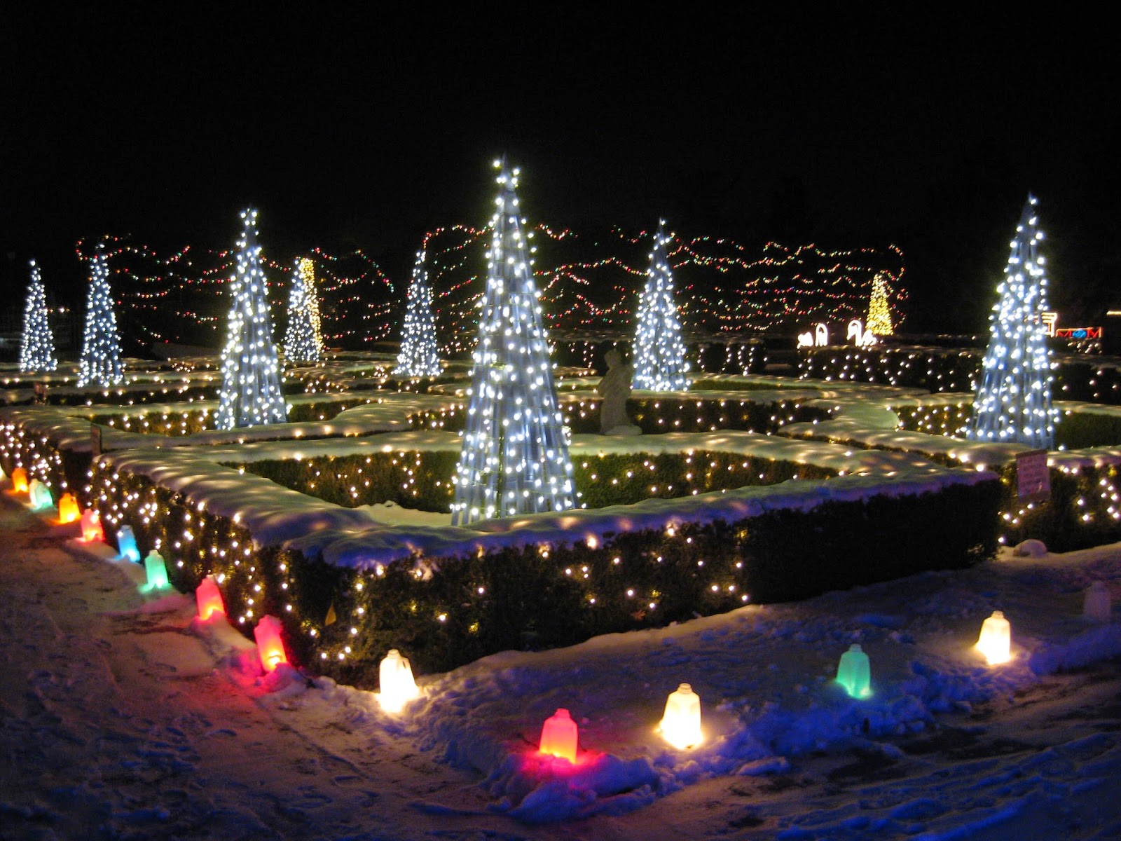 It was a frigid day although not unbearable. I did have my camera with me outside all day as I slung cords with hopeful abandon. While I took some photos with frozen fingers, most were not "blog-worthy"! The awesome photo above was shared by Marsha M. I opted instead to share some 2013 Holiday Lights Show (HLS) photos to inspire and entice readers to come enjoy the show this December. Better yet, come to the premiere of this light show at the Taste of Chocolate (TOC) event on November 22nd. We are 91.5% done with the show with completion predicted for next Tuesday and testing/tweaking/primping to follow before Saturday.