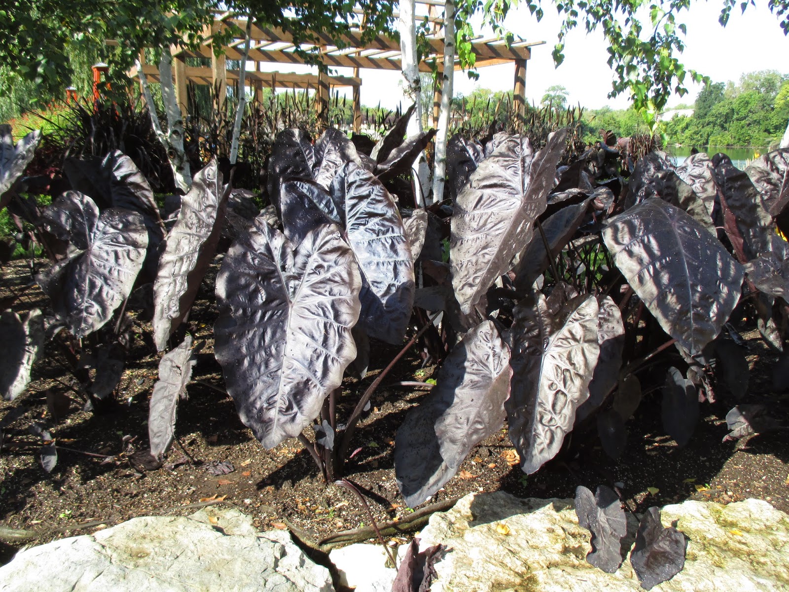 With the premiere of the Holiday Lights Show (HLS) looming this Saturday as part of the Taste of Chocolate (tickets still available!), we tested the show today and finished both set-up and running cords. Big John, Larry and I spent the entire day outside and became living ice cubes. We had electrical help from Tom C. and Bob K. and also saw Maury (ran errands), Mark S., Marv B., Vern and a couple others. We'll be testing and tweaking the show over the remainder of the week. Below are some shots to make you think "summer"! These are all Colocasias (with Alocasias to be promoted in a future blog).