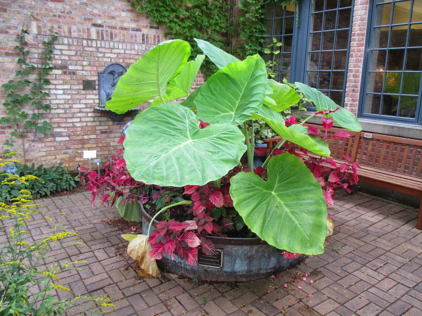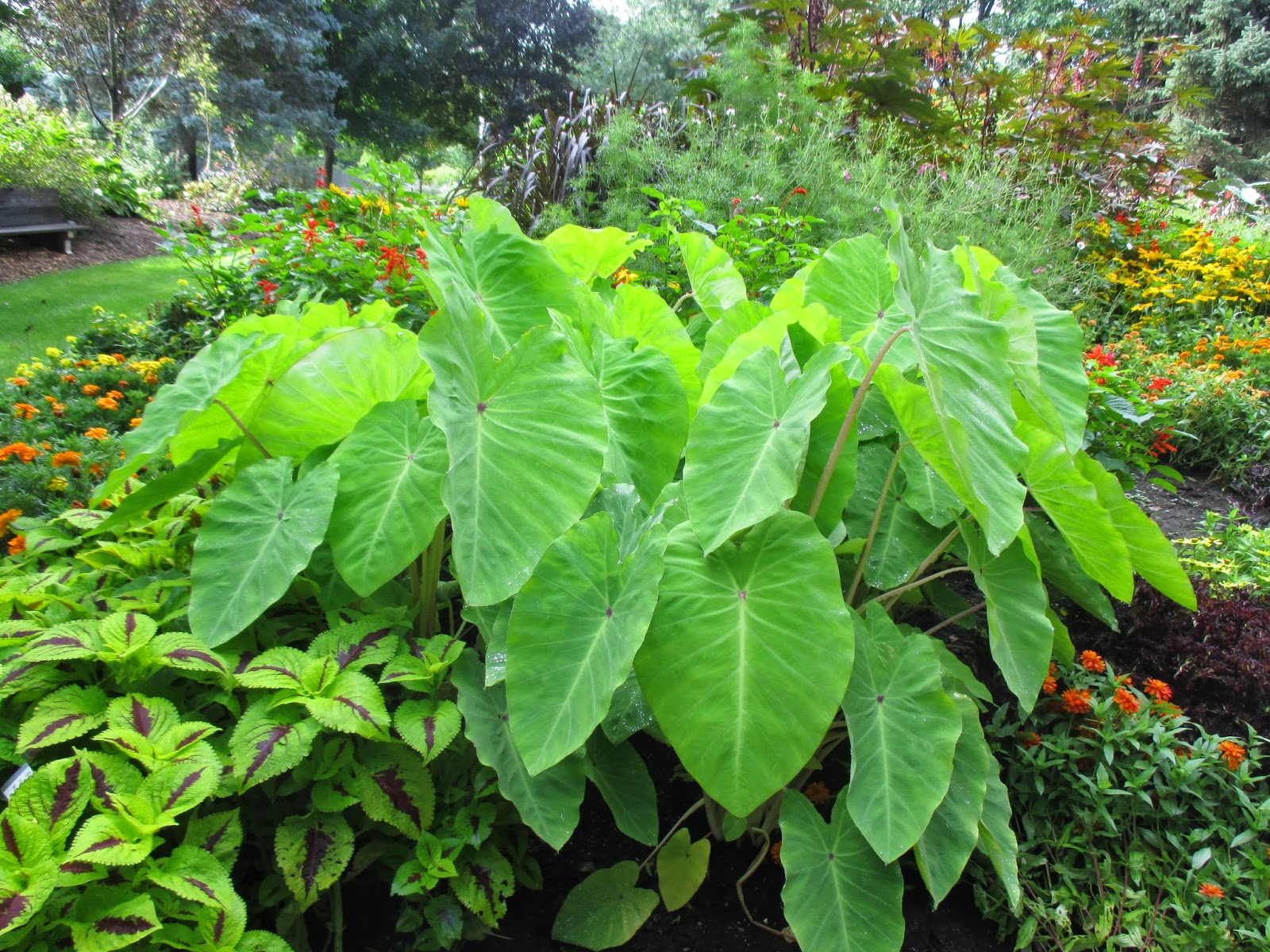 Due to another brutally cold day (-1 degree F wind chill) and the fact that my camera froze (before I dropped it), I thought I'd show some "warmer" photos. These are all elephant ears (Colocasia sp.) and my reason for showing them is twofold. We have done well growing them (like 'Royal Hawaiian Maui Gold' above) over the years and in 2015, we'll have a large collection of these on display (including everything you see here and more!) in the three demonstration beds. We'll include all types of Colocasia sp. and Alocasia sp. I hope to acquire 50+ kinds for display.