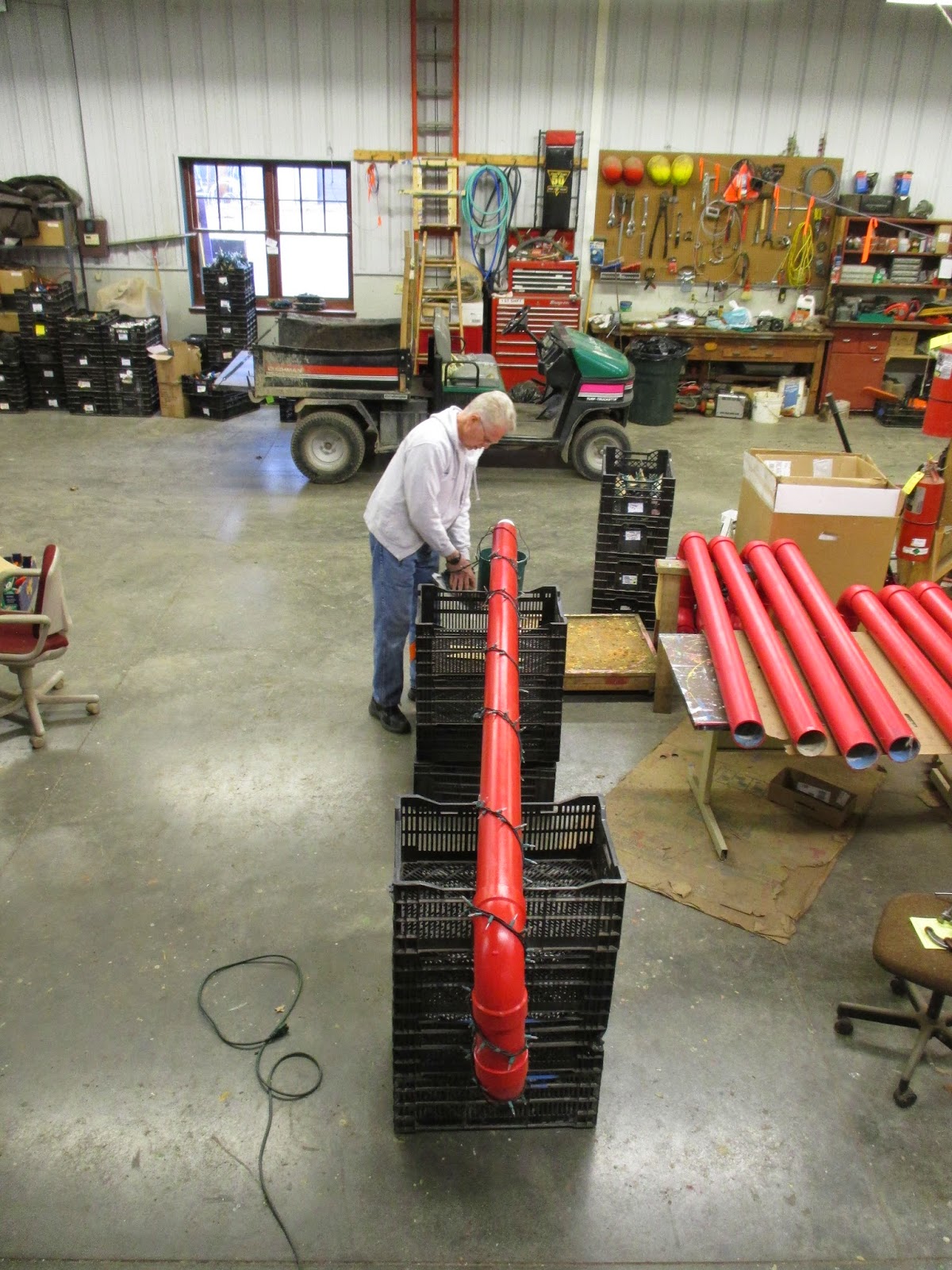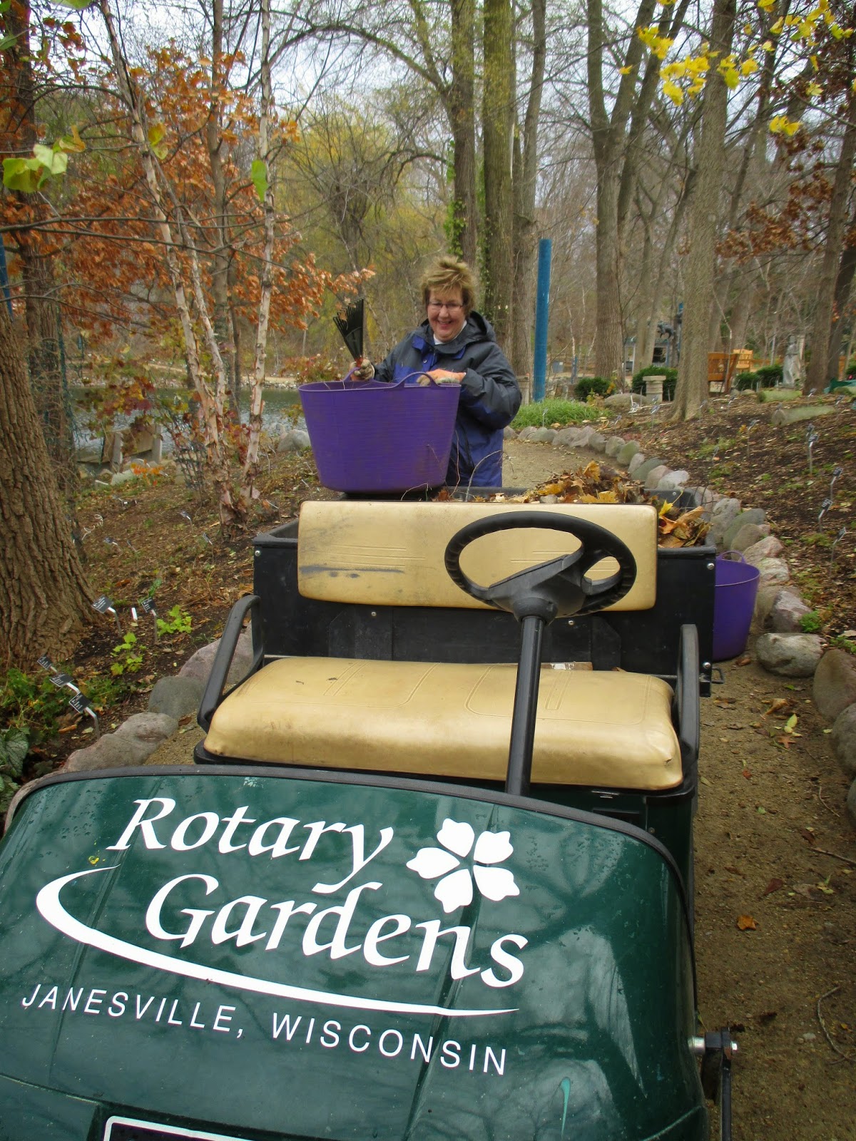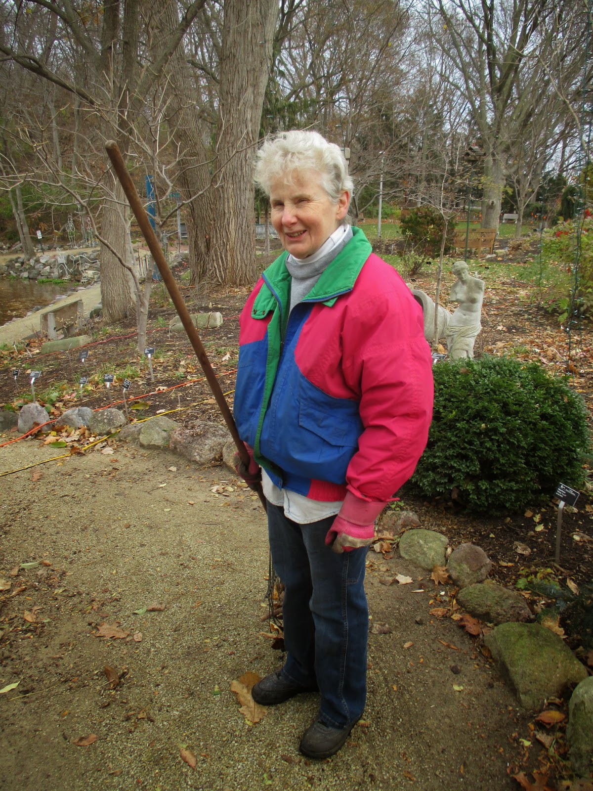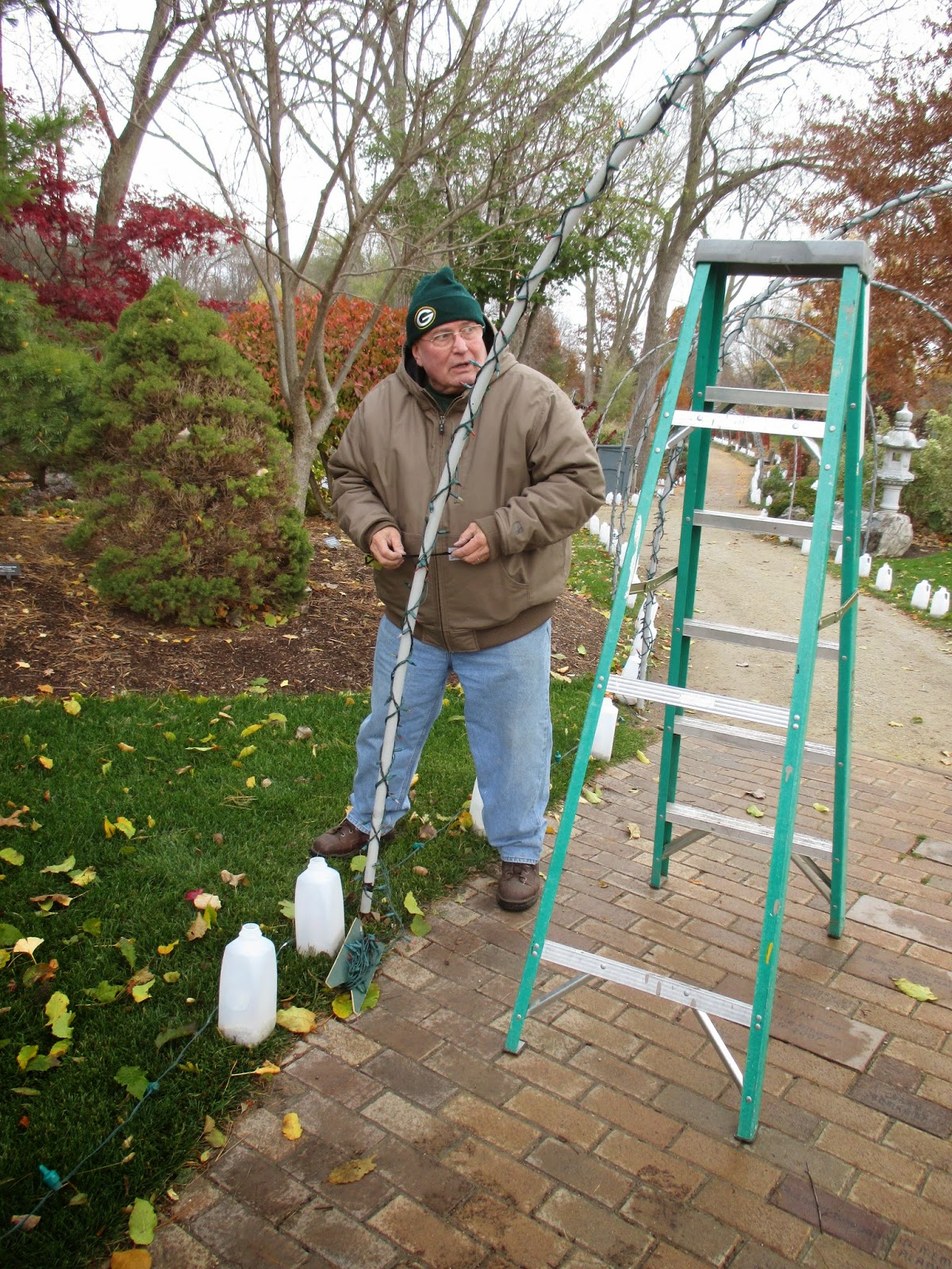 There was a wide assortment of talented volunteers at the gardens today doing projects both inside and outside. Above is Gary putting lights on some of our giant candy canes. Directly below is Ron P. who worked with Pat M. on more lights repairs and preparations. Those two guys were our primary repair folks for the HLS although Patrea, Joe and Shirley C. helped significantly as well. The carpenters (Dave, Jim, Ron Y. and Bob K.) had more carpentry projects and painting to accomplish - all related to the looming HLS. Vern stopped by later in the day and will be back in action soon. The second photo down shows Alan, who along with Ken, did a nice job raking in multiple areas. Gary B. (third photo down) was a trooper and tackled putting lights on our arches which is not a quick process. Bonnie, Eva and Peg (see photos further down) did a great job collecting more debris in multiple areas and Peg earned overtime by staying for most of the afternoon too. Maury ran errands for us and joined Dick P. and Dick H. for hauling and storing our terrace furniture for the winter. The guys also put our big fountains away for the winter. Bill O. collected lots of leaves later in the day and Urban was in for continued pruning this afternoon. We also saw Rollie and many others today.