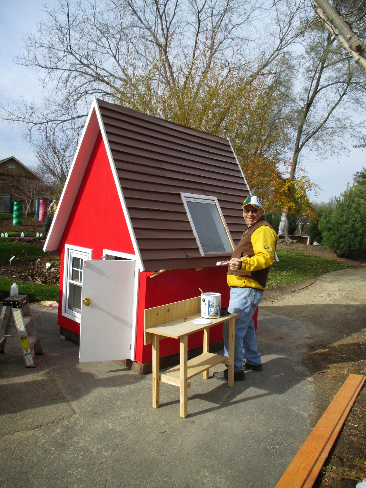with safety a primary concern for us, Jim (left) and Dave are helping move over pieces of the "elf house" seen below being painted by Vern