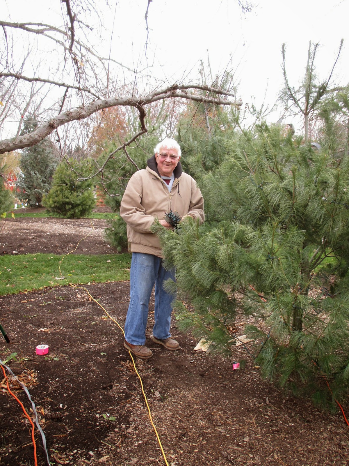 We had a great crew of Grumpies this morning. Bob K. (above) was put in "solitary" for awhile but came out to help with carpentry and lights set-up after serving his time. Jim, Dave, Bob, Dick H. and Vern helped move the elf house (see below) in to place. These two structures will be decorated (inside and outside) and are new additions to the HLS this year. Maury, Dick P., Rollie, Gary and Mark S. brought over lights and decorations for the Parker Education Center and did some early interior set-up for the HLS. The guys all shifted to other projects as well. Alan M. (third photo down) earned overtime today with lots of raking (well in to the afternoon) and along with Ken and both Patrea and Kathy (fourth photo down, Patrea driving), the gang brought back many loads of debris. Dr. Gredler was in for mowing and Urban came in for some afternoon pruning. Pat M. had some HLS work to accomplish and Ron P. helped test and repair lights for the decorating project at the other building. Whitey (fifth photo down) was decorating trees most of the day and has been a consistent fixture out in that area since late last week. Bob K. shifted over to help in the early afternoon. Gary B. and Bob C. finished putting lights on our HLS arches and Larry H. did a nice job continuing to put up netting on select shrubs for winter deer protection. The sixth photo down shows Maury helping move our tropicals from the greenhouse to the horticulture center for winter storage. Lots of guys helped and this was coordinated by John and Terry. Del did a nice job sweeping and we also saw Janice, Dr. Yahr, Carl (new Grumpy) and many others today.