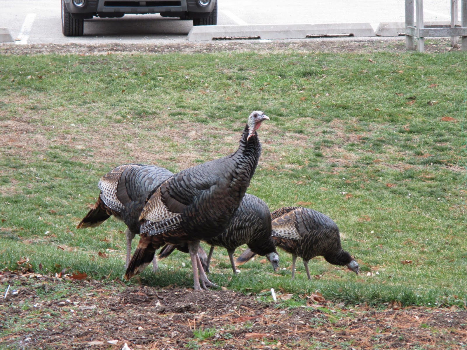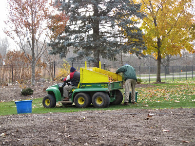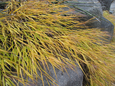 We had some "tough cookies" (volunteers) show up today to help out in the gardens and with some indoor projects. The cooler weather does have an impact on our volunteer turnout (obviously) but we did have a great crew that braved the 20 degree F start to the day. Above is the 'All Gold' Hakone grass (Hakonechloa macra) still showing some color after a very hard frost last night. There are still spots of color here and there although I'm starting to take my annual, November photographs of ornamental bark. Anything that was still blooming is now freeze dried! The Horticulture Center saw some activity today including a visit from our roving gang of turkeys (directly below). Further below are more photos from today.