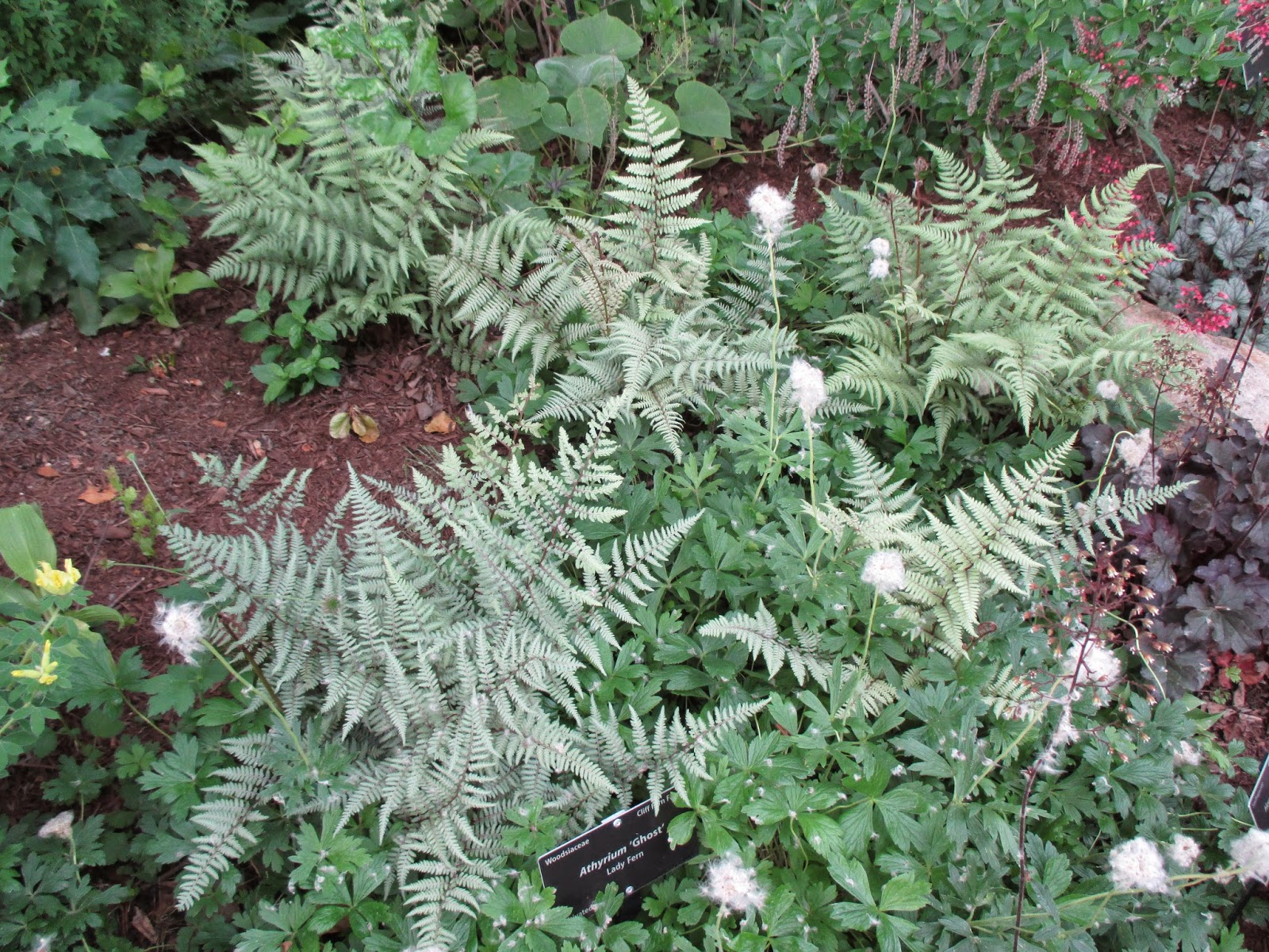 "No ghost was ever seen by two pair of eyes." Thomas Carlyle. I would argue that quote as it relates to the 'Ghost' hybrid painted fern (Athyrium hybrida) which I think is appreciated by everyone that sees it and grows it. This silvery fern is a hybrid between the native lady fern (Athyrium filix-femina) and the Japanese painted fern (Athyrium niponicum var. pictum). This fern, which came out 10 years ago?, has the benefit of the vigor and height of the lady fern and the silver patina of the painted fern. I love this fern and we've planted over 50 at the gardens. While the painted ferns are usually in the 15" height range, 'Ghost' can offer that same look on a plant close to 30" in height. The spring coloration has more of a light green/silver combination with the best silvering coming by mid-summer. While the silvering might not rival some of the other painted ferns (Athyrium niponicum), it is not insignificant. Position these in part sun in decent soils with adequate moisture and you can't go wrong. Unhappy specimens in dry locations or full sun can get quite scorched by mid summer and become unsightly quickly. We punctuate most of our shadier gardens with 'Ghost' as it offers some nice illumination of color in locations that rely heavily on foliage. All of these photos are of the 'Ghost' fern. There are some other exciting hybrids between lady ferns and painted ferns. Check out 'Branford Beauty', 'Branford Rambler' and 'Ocean's Fury' (crested) for some other fun options.