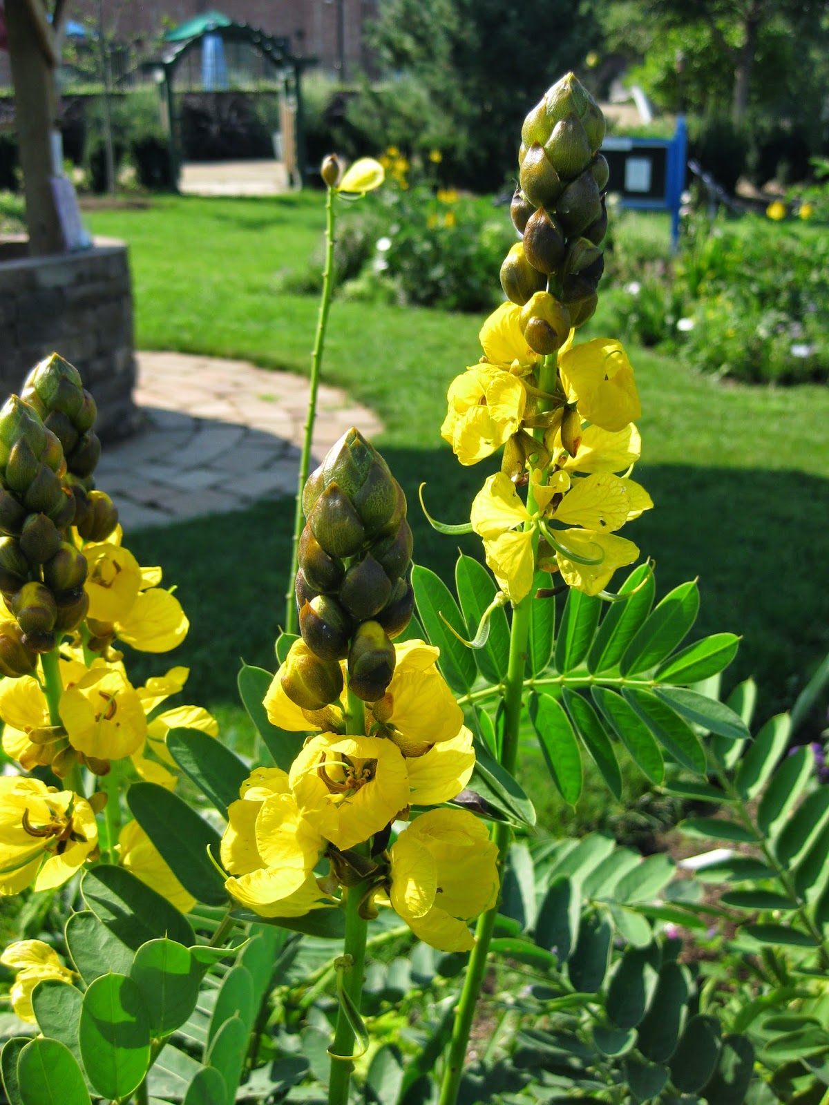 Over the past five years, we've enjoyed growing the popcorn cassia (Cassia didymobotrya). Also called popcorn senna and peanut butter plant, this tropical (native to Africa) thrives in our summer heat. This showy legume (Fabaceae) will get 20' and taller in native ranges although for us, it will stretch up to 4-5' in a season. We usually plant them at 18" tall and they will add another 3'-5' in height depending on how the summer goes. Adequate watering, decent soils and occasional fertilizer are all very helpful as well. The photo above shows the beautiful blue green foliage of popcorn plant as well as the architectural blooms which attract both bees and butterflies. The blooms are profuse in July and will continue well in to September and all the way until the first hard frost. We donated a plant to a school garden (see below) and the kids seem to be enjoying the scent. I think the flowers smell like buttered popcorn although others say they detect peanut butter...? Regardless, rubbing the flowers and foliage will create an interesting sensory experience. We plant about 50 of these each year and while we have dabbled with different ways of storing them over the winter, we have been unsuccessful. It's a fun plant to photograph as seen in these many images.